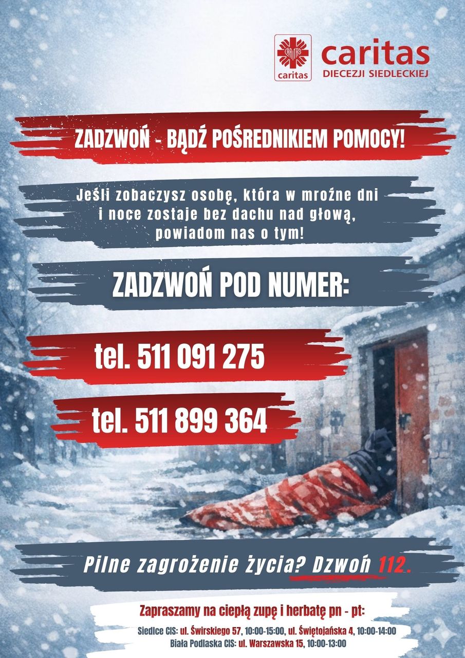 Jeśli ktoś z nas spotka osobę, która w mroźne dni i noce zostaje bez dachu nad głową, może powiadomić pracowników Caritas Diecezji Siedleckiej. Wysraczy zadzownić na jeden z tych numerów: