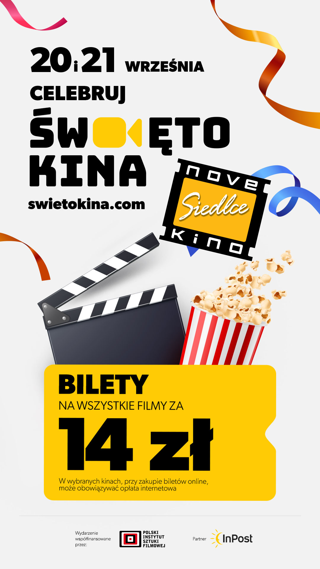 Nadchodzący weekend 20–21 września zapowiada się wyjątkowo atrakcyjnie dla miłośników kina. W ramach ogólnopolskiego Święta Kina w NoveKino Siedlce wszystkie bilety na wszystkie filmy będą dostępne w specjalnej cenie – 14 zł.