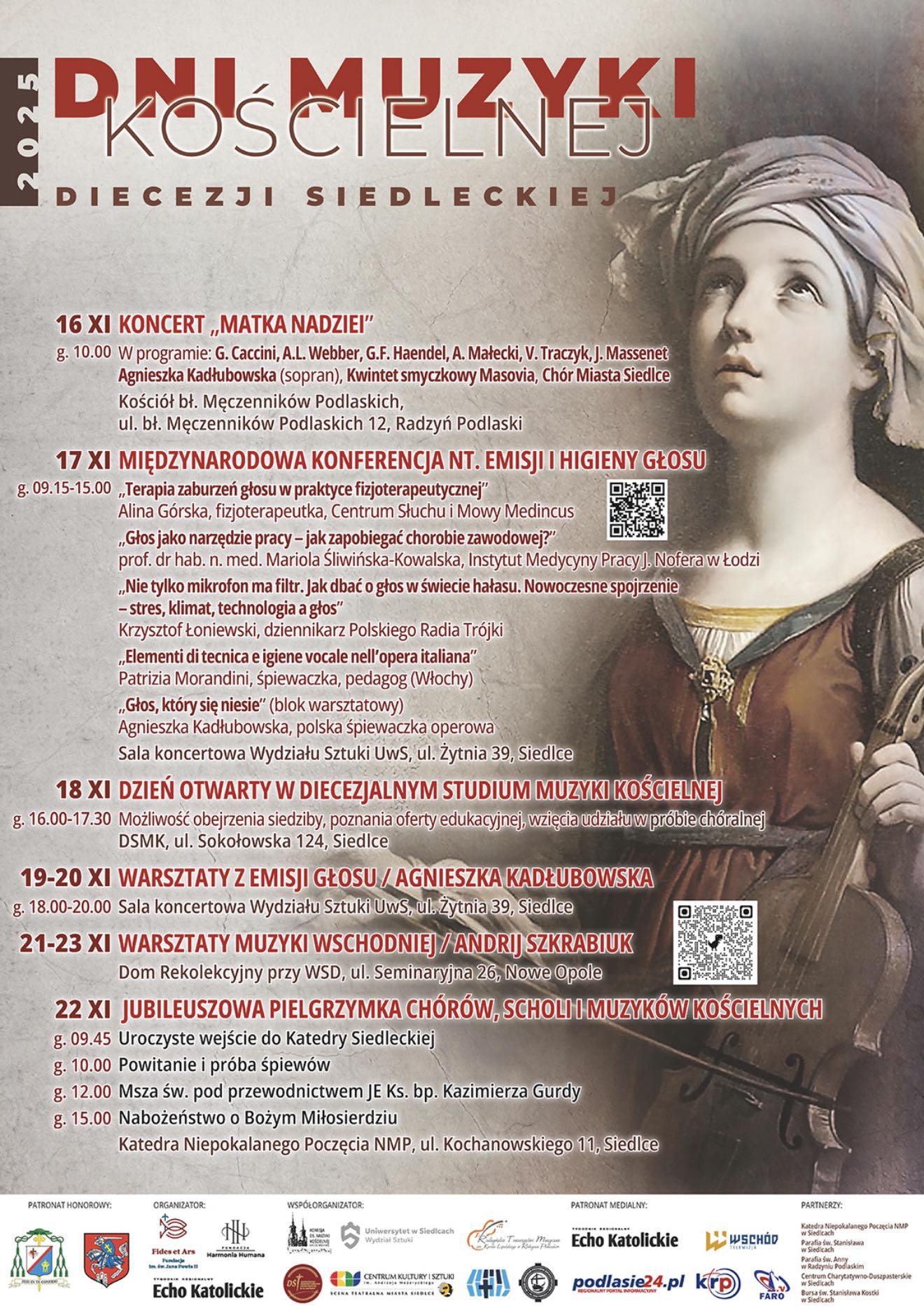 Wydarzenie otworzy 16 listopada koncert „Matka Nadziei” w kościele bł. Męczenników Podlaskich w Radzyniu Podlaskim. Wystąpią m.in. Agnieszka Kadłubowska (sopran), Kwintet Smyczkowy Masovia oraz Chór Miasta Siedlce. W programie znajdą się utwory G. Cacciniego, A. L. Webbera, G. F. Haendla czy A. Małeckiego.Kolejnego dnia, 17 listopada, odbędzie się Międzynarodowa Konferencja nt. Emisji i Higieny Głosu. To propozycja dla pedagogów, muzyków, dziennikarzy, lektorów i wszystkich pracujących głosem. Uczestnicy wysłuchają wykładów m.in. o terapii zaburzeń głosu, ochronie słuchu i emisji głosu w warunkach współczesnego hałasu. Zaplanowano także blok warsztatowy „Głos, który się niesie”, który poprowadzi solistka Agnieszka Kadłubowska.