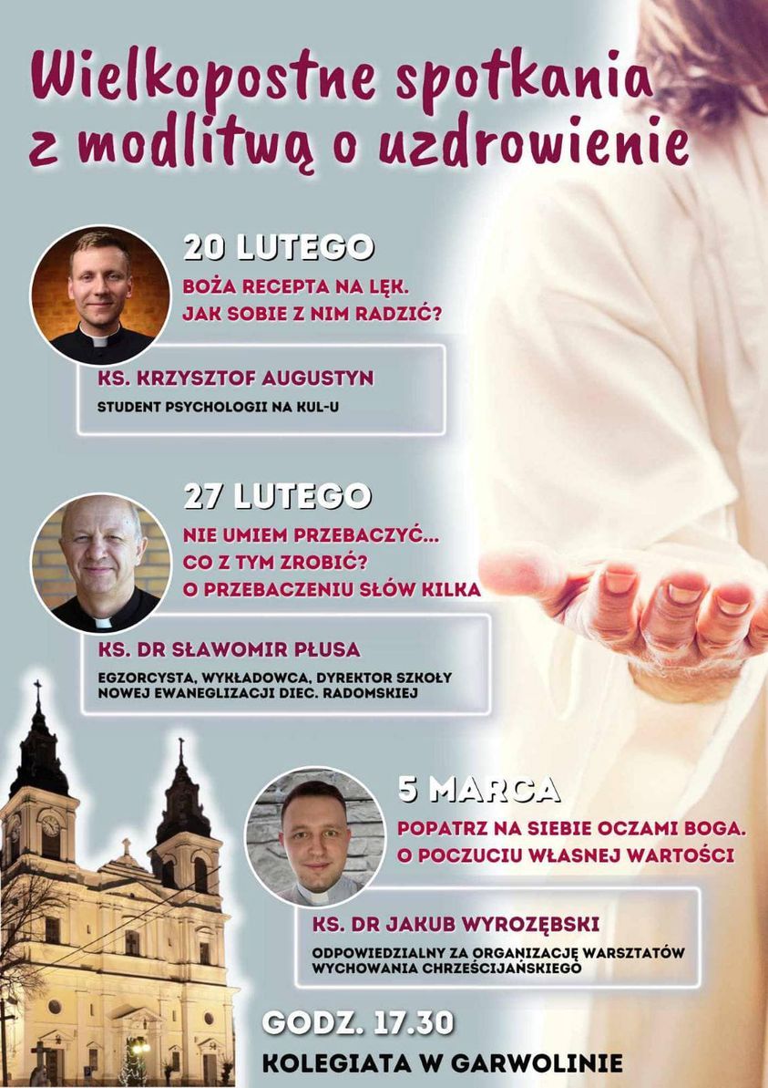 Przez trzy kolejne wtorki, począwszy od 20 lutego, w garwolińskiej kolegiacie Przemienienia Pańskiego o godz. 17:30 odbędą się „Wielkopostne spotkania z modlitwą o uzdrowienie”. W programie ciekawe wykłady na życiowe tematy.