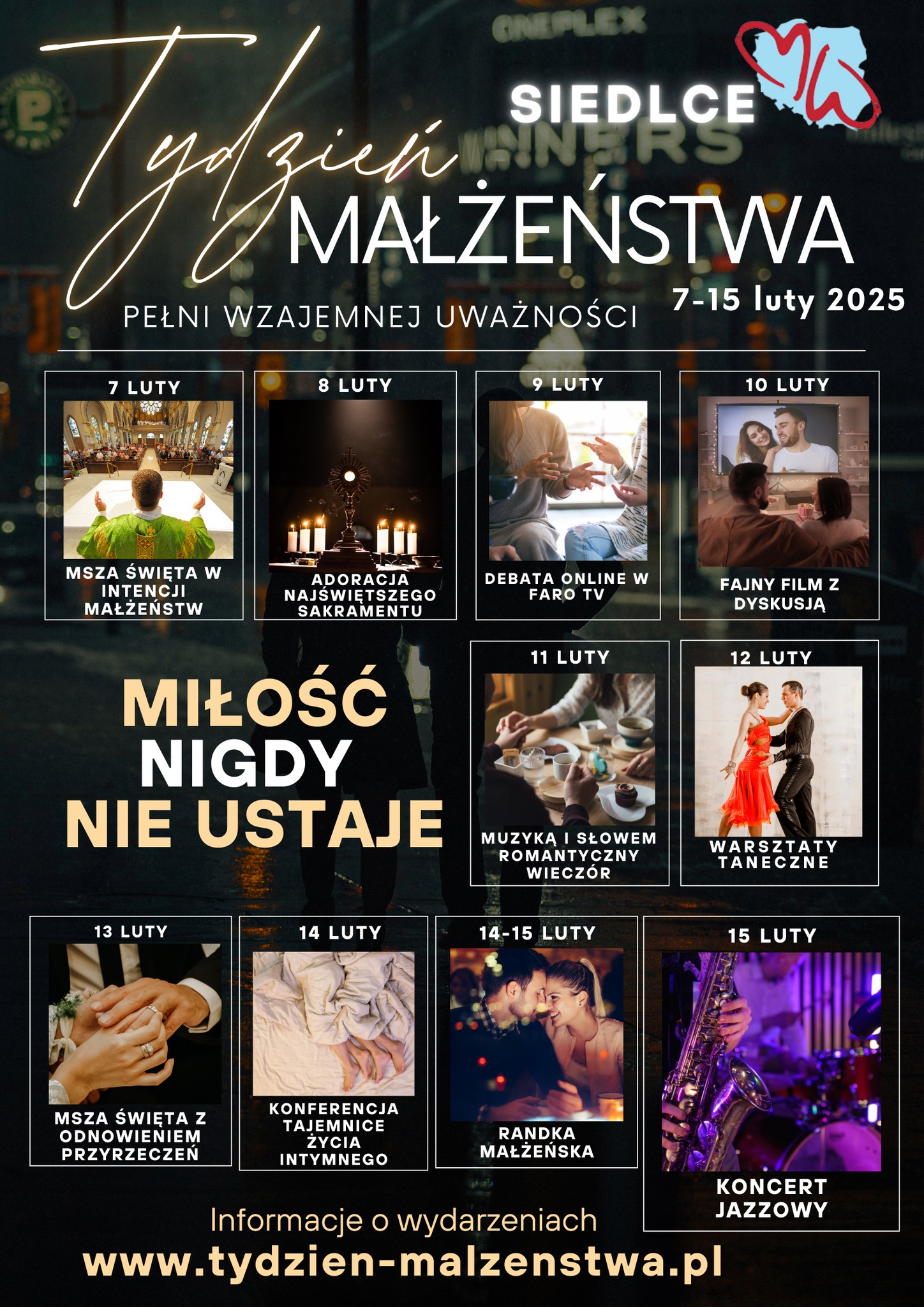 Tydzień Małżeństwa – trwający od 7 do 14 lutego to międzynarodowy projekt ukierunkowany na szczególną więź kobiety i mężczyzny, który odbywa się od lat równolegle w kilkudziesięciu krajach. Nie jest to inicjatywa komercyjna, lecz społeczna promująca małżeństwo we współczesnym świecie. Kampania skierowana jest do wszystkich małżeństw niezależnie od stażu. Organizatorzy zapraszają pary, którzy chcą wspólnie, twórczo i nietypowo spędzić czas we dwoje.Podczas trwania Tygodnia Małżeństwa w Siedlcach można skorzystać z szeregu propozycji ukierunkowanych na rozwój związku i relacji. Zainteresowani zaproszeni są na małżeńską adorację Najświętszego Sakramentu, Mszę św. z odnowieniem przyrzeczeń małżeńskich, konferencje, koncert, wieczór filmowy oraz małżeńską sesję fotograficzną.