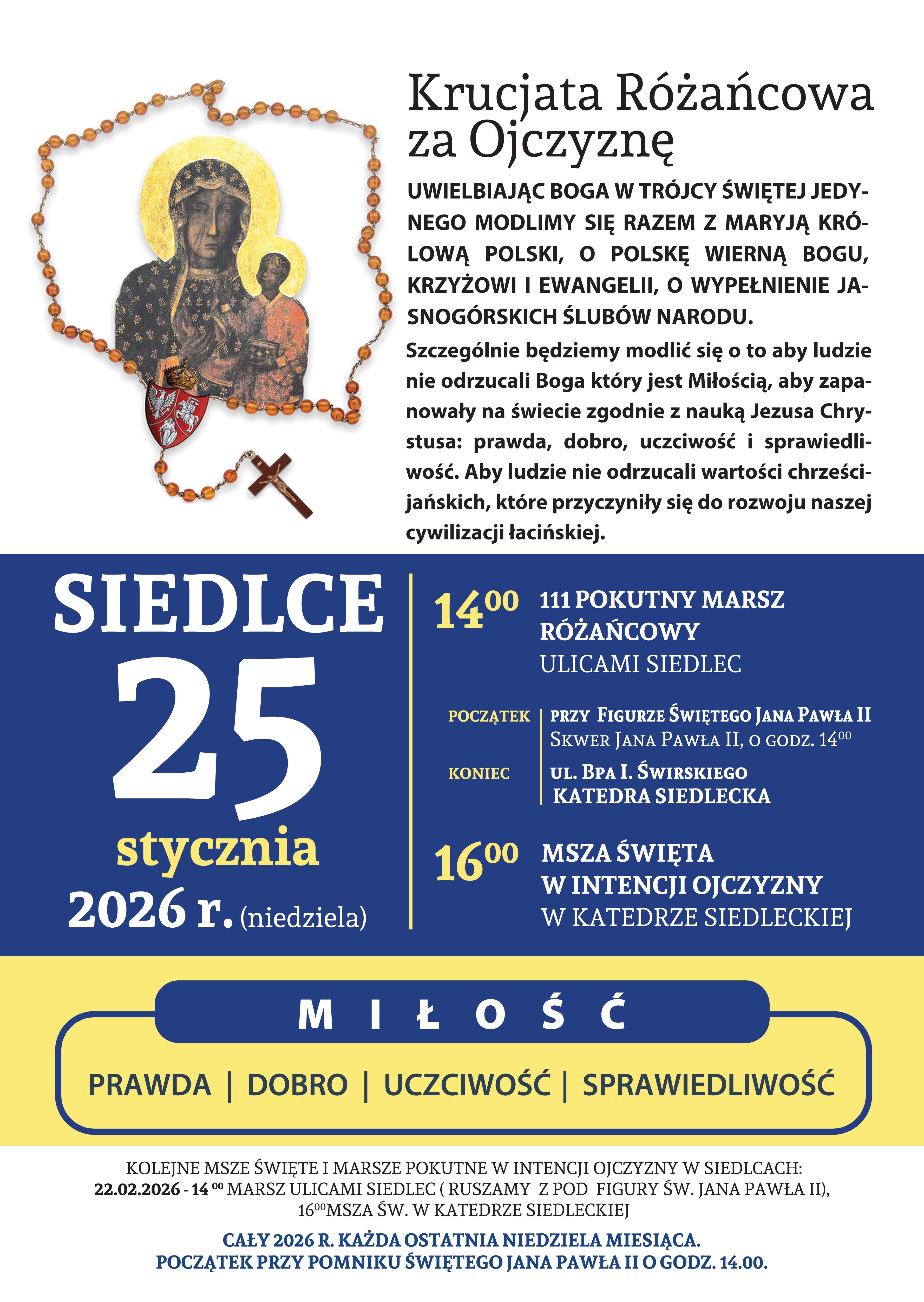 Ulicami Siedlec przejdzie Pokutny Marsz Różańcowy za Ojczyznę – modlitewne spotkanie, podczas którego wierni zawierzą Ojczyznę Bogu w Trójcy Świętej Jedynego i będą prosić o wypełnienie Jasnogórskich Ślubów Narodu. To cykliczne spotkanie odbędzie się w niedzielę, 25 stycznia.