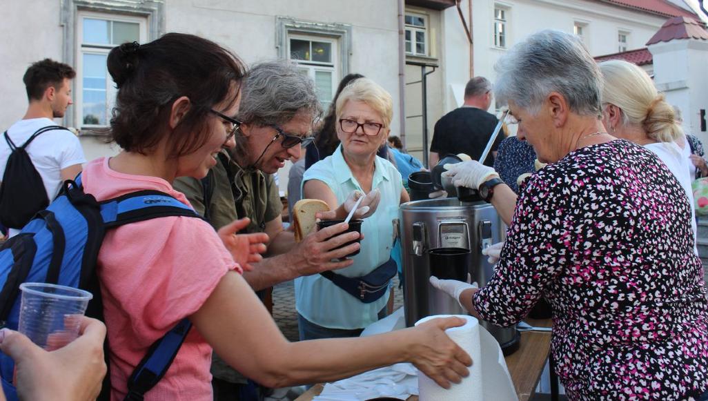 Na pielgrzymów czekali parafianie wraz z ks. Błażejem Samociukiem i siostrami karmelitankami. Oczekiwaniu towarzyszyły radosne przygotowania, szczególnie zadbano o suto zastawione stoły, które uginały się od pyszności. Były zupy, bigosy, pieczone mięsko, racuszki i naleśniki z różnorodnym nadzieniem. Były osoce, słodycze napoje. Przygotowali to parafianie i przyjaciele parafialnej wspólnoty, dołączyli przedstawiciele gastronomii. Wszyscy czekali na pielgrzymów. Jednak mieli coś więcej niż smaczne jedzenie. Czekali z bijącymi sercami, z wielkim przejęciem, że mogą podzielić się tym co mają, z utrudzonymi pielgrzymami.Spotkanie przerosło najśmielsze oczekiwania, było wzruszenie, były łzy, długie rozmowy, wspólny śpiew, prośby o modlitwę. Kto mógł dołączył do pielgrzymkowej Mszy Św. którą sprawowano w kościele parafialnym. Modlitwa pełna muzyki, śpiewu i gorących serc pokazała siemiatyckim parafianom trochę inne oblicze Kościoła. Pokazała wspólnotę, która nikogo nie odtrąca, nie ocenia, w której każdy znajdzie swoje miejsce. Po Mszy Św. i adoracji wielu pielgrzymów znalazło nocleg w domach mieszkańców Siemiatycz.