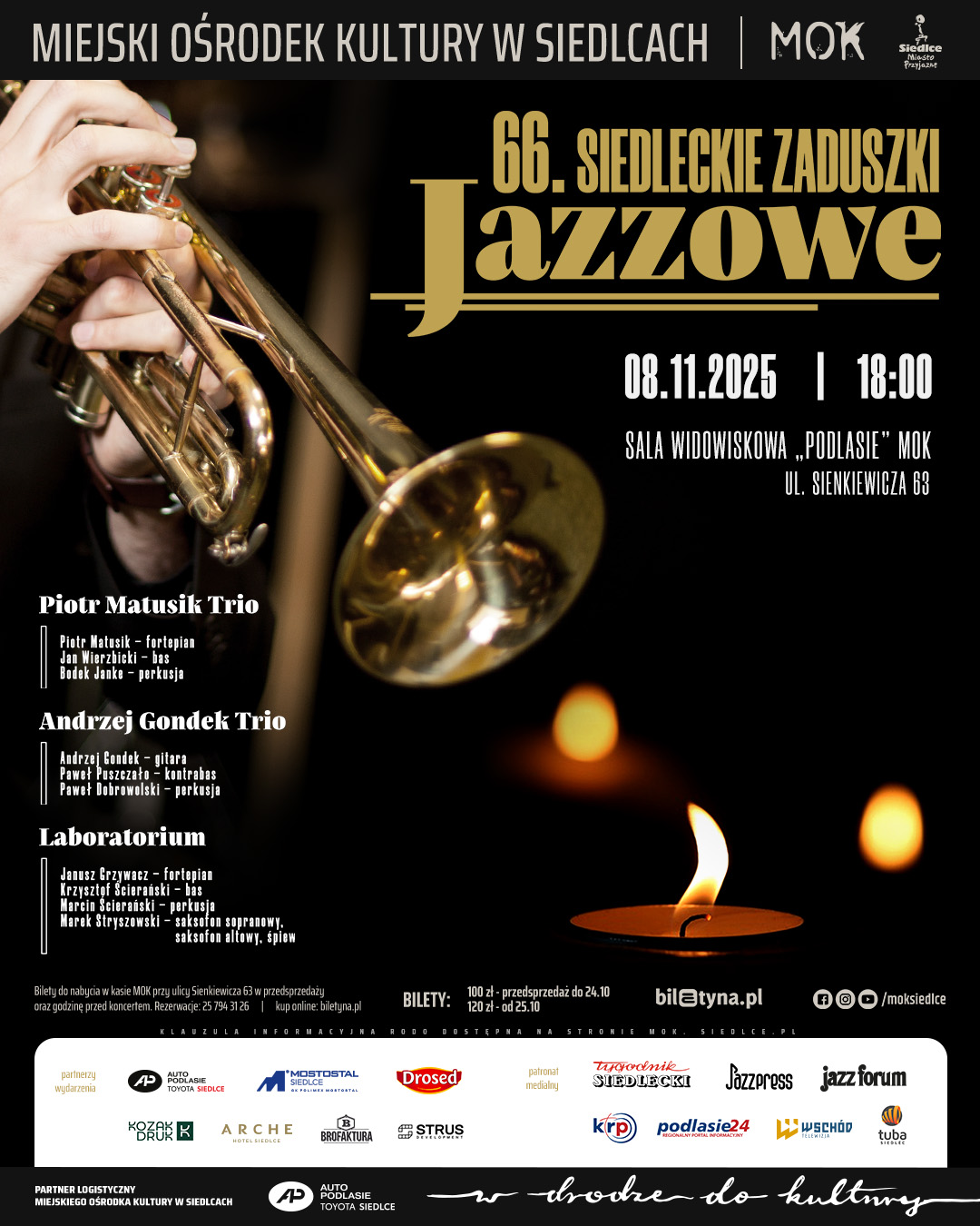 66. Siedleckie Zaduszki Jazzowe powstają przy współpracy z partnerami: Auto Podlasie Toyota Siedlce, Mostostal Siedlce, Arche Hotel Siedlce, Kozak Druk, Drosed S.A., Strus Development oraz Siedleckim Browarem Restauracyjnym Brofaktura.