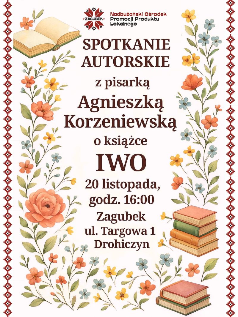 Spotkanie autorskie poświęcone promocji książki będzie także okazją do rozmowy o literaturze, inspiracjach oraz procesie tworzenia powieści. Autorka opowie o kulisach powstania „Iwo” oraz o przesłaniu, jakie niesie opisana historia.Agnieszka Korzeniewska od lat obecna jest na scenie literackiej. Spod jej pióra wyszły cenione w kraju i za granicą tytuły, m.in. „Zabiorę Cię jesienią do Brukseli”, „W deszczu tańcz!”, „Zaczarowana codzienność” czy „Witraż”.
