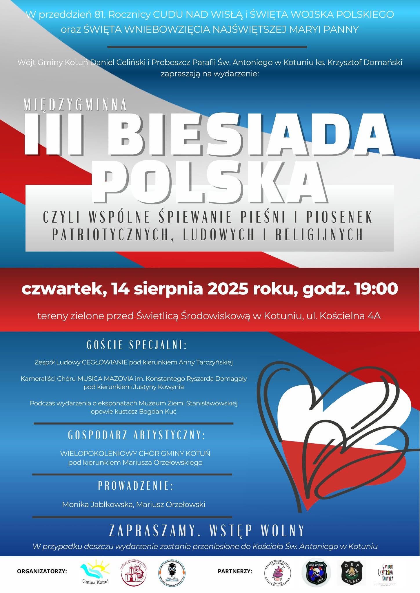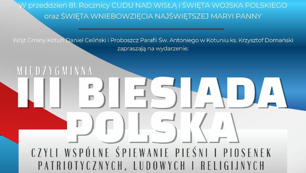 Okazja do wspólnego śpiewu pieśni i piosenek patriotycznych, ludowych oraz religijnych. W Kotuniu 14 sierpnia, w przeddzień Święta Wojska Polskiego oraz Uroczystości Wniebowzięcia Najświętszej Maryi Panny, odbędzie się trzecia Międzygminna Biesiada Polska.