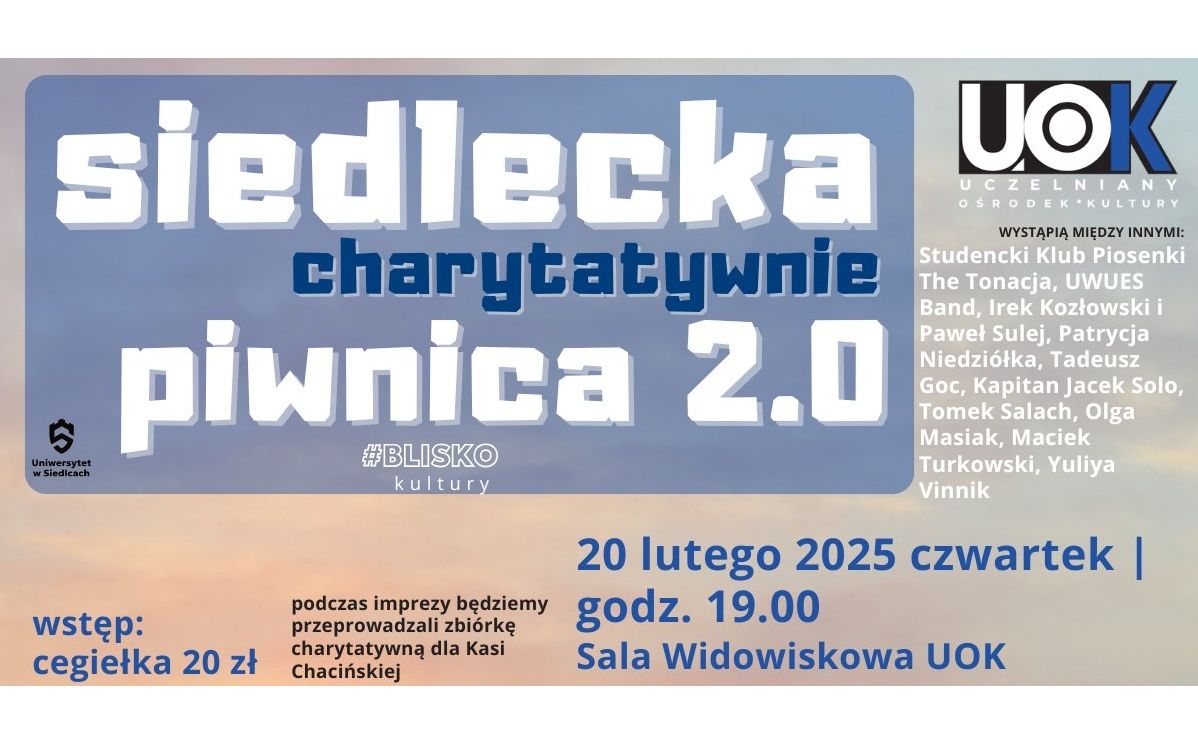 Siedlecka Piwnica na stałe wpisała się w program działania Uczelnianego Ośrodka Kultury i stanowi jedyne w swoim rodzaju muzyczne spotkanie siedleckich artystów. Każdy z koncertów połączony jest z akcją pomocy. W lutowej edycji, Uczelniany Ośrodek Kultury zachęca do wsparcia leczenia siedlczanki Katarzyny Chacińskiej - dziennikarki Katolickiego Radia Podlasie i portalu podlasie24.pl.