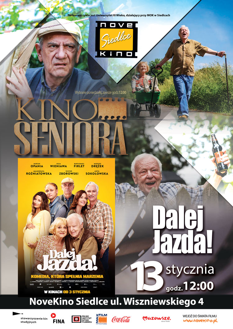 Film pt. „Dalej jazda” zostanie wyświetlony podczas pierwszego w tym roku spotkania w Cyklu Kino Seniora. Ta produkcja to dowód na to, że starość nie musi być nudna. To film, który pokazuje, że nawet w domach opieki można znaleźć przygodę życia... albo przynajmniej dobry powód, żeby wsiąść w samochód i ruszyć w drogę. Początek seansu w poniedziałek, 13 stycznia o godzinie 12:00 w Novekino Siedlce.