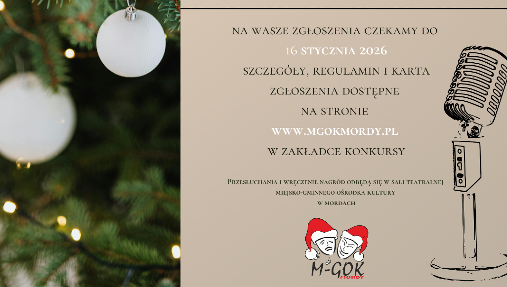 🎤 Przesłuchania konkursowe rozpoczną się 24 stycznia o godz. 10.00 w sali teatralnej Miejsko-Gminnego Ośrodka Kultury w Mordach.