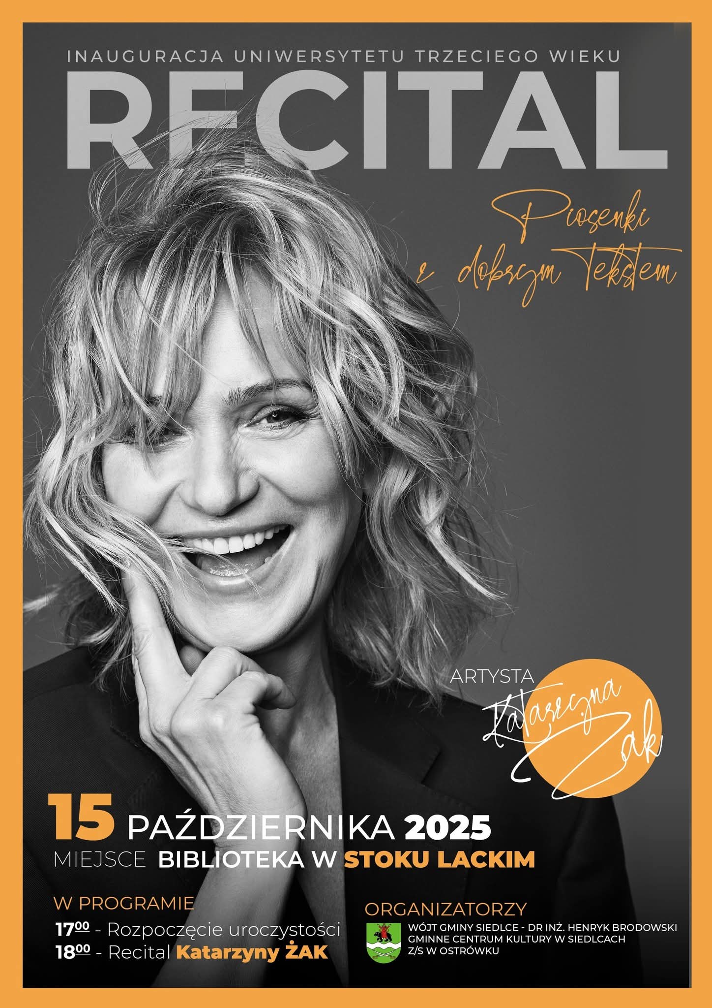 Uroczysta inauguracja Uniwersytetu Trzeciego Wieku Gminy Siedlce odbędzie się 15 października w Bibliotece przy ul. Pałacowej 60 w Stoku Lackim. Wydarzenie uświetni recital znanej aktorki i wokalistki Katarzyny Żak, zatytułowany „Piosenki z dobrym tekstem”.
