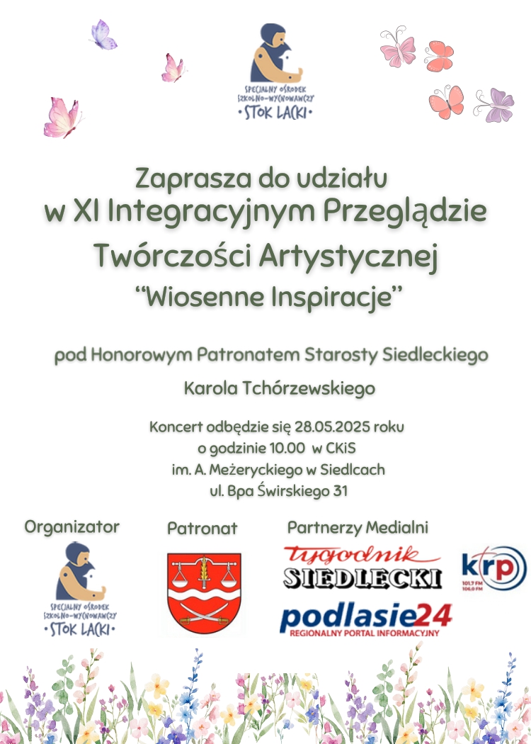 28 maja o godz. 10:00 w Centrum Kultury i Sztuki w Siedlcach odbędzie się XI Integracyjny Przegląd Twórczości Artystycznej „Wiosenne Inspiracje” . Organizatorem wydarzenia jest Specjalny Ośrodek Szkolno-Wychowawczy w Stoku Lackim.