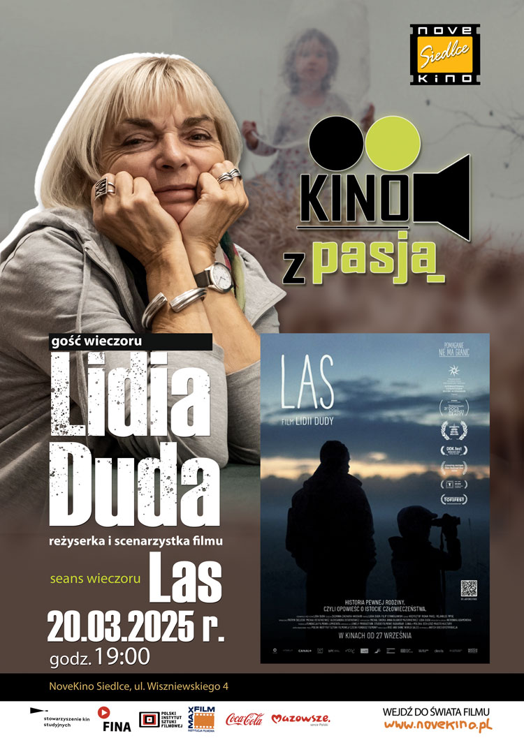 Spotkanie odbędzie się w czwartek, 20 marca o 19:00 w Novekino Siedlce.Lidia Duda - ceniona reżyserka i scenarzystka filmów dokumentalnych. Jej filmy pokazywane były w konkursach na kilkudziesięciu zagranicznych festiwalach filmowych. Zdobywczyni Grand Prix m.in. w Chicago, Nowym Jorku, Huston, Istambule, Meksyku, Moskwie, Banff, Kantonie i Pradze. Zdobywczyni Grand Press za „U nas w Pietraszach". Dwa razy otrzymała Grand Prix Złoty Lajkonik na Krakowskim Festiwalu Filmowym za filmy „Herkules"(2005) i „Uwikłani" ( 2012). „Pisklaki” nagrodzone zostały m.in. na Międzynarodowym Festiwalu Filmowym w Locarno, a jej ostatni film „Las” m.in. na MFF w Salonikach. Od prawie 30 lat pracuje jako wolny strzelec. Należy do Stowarzyszenia Filmowców Polskich, Polskiej Akademii Filmowej, Gildii Polskich Reżyserów Dokumentalnych. Od 2006 roku ekspertka ds. filmu dokumentalnego w Polskim Instytucie Sztuki Filmowej, W latach 2020-2023 członkini Rady PISF.