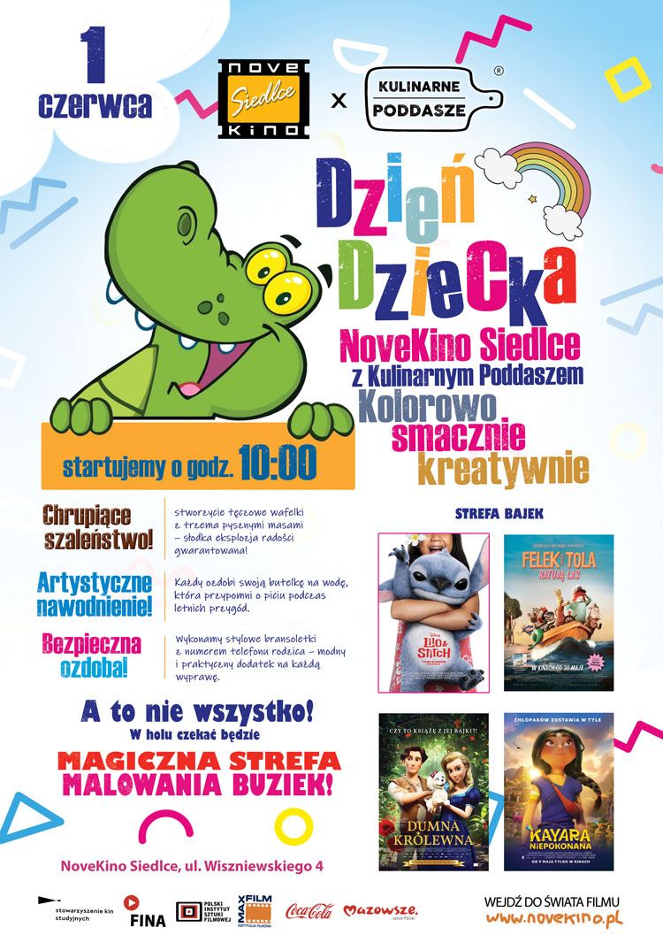 W niedzielę, 1 czerwca, w NoveKino Siedlce odbędą się obchody Dnia Dziecka, przygotowane we współpracy z Kulinarnym Poddaszem. Organizatorzy zaplanowali bogaty program atrakcji, który ma zapewnić najmłodszym dzień pełen kreatywności, kolorów i dobrej zabawy.