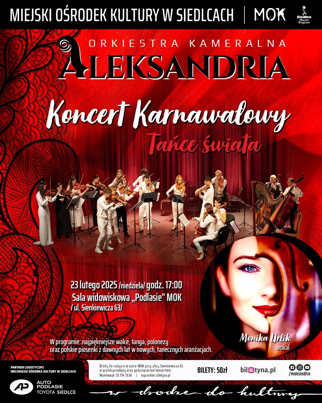 Orkiestra Kameralna „Aleksandria” wystąpi w Siedlcach. W programie karnawałowego koncertu, znajdą się najpiękniejsze walce, tanga, polonezy oraz polskie piosenki z dawnych lat w nowych, tanecznych aranżacjach. Razem z Orkiestrą wystąpi wokalistka Monika Urlik.
