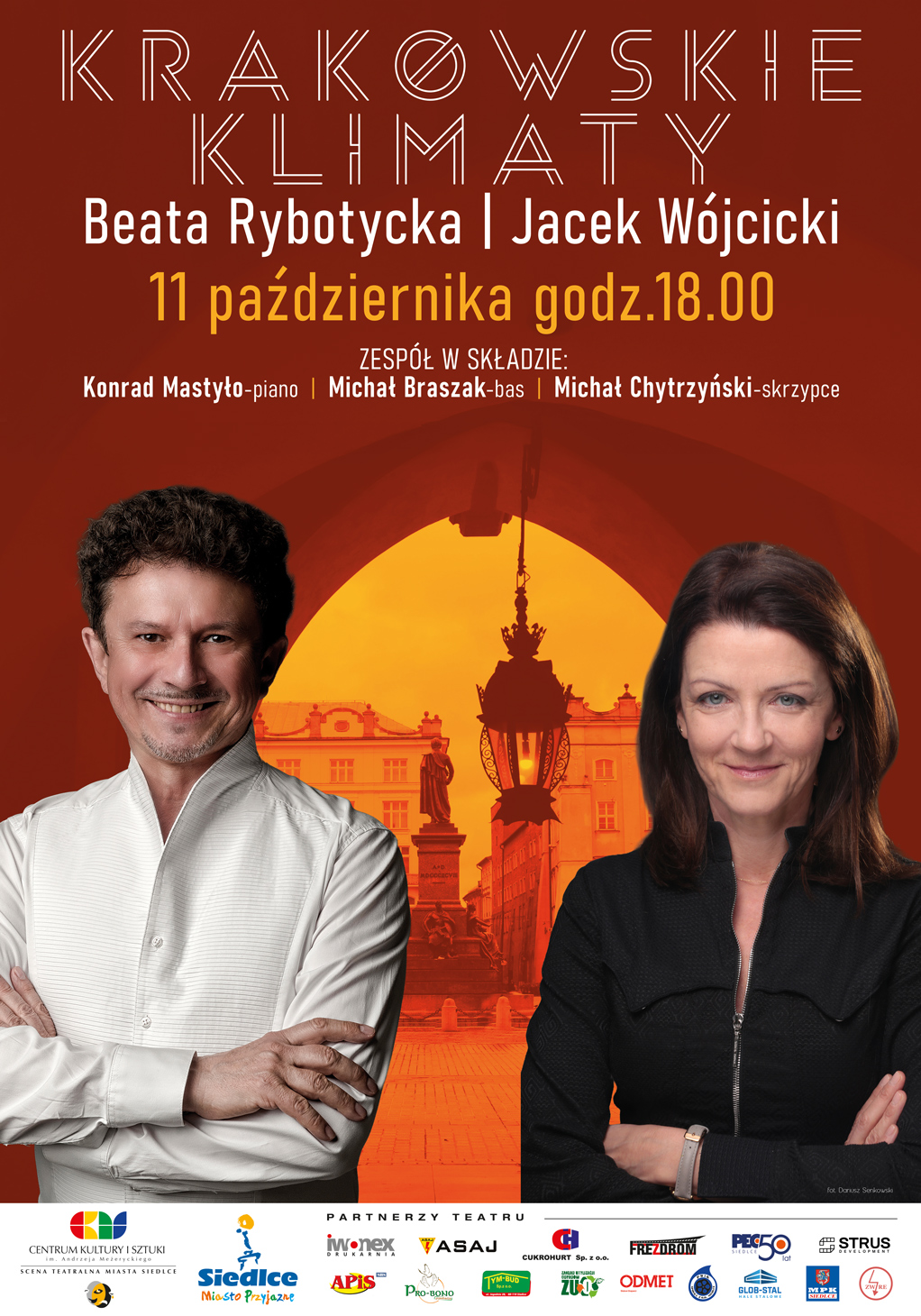 Beata Rybotycka i Jacek Wójcicki pojawią się na Scenie Teatralnej Miasta Siedlce, by wspólnie z zespołem muzycznym przenieść publiczność w niepowtarzalny klimat artystycznego Krakowa. Występ, który połączy muzykę, teatr i poezję, dopełnią dźwięki fortepianu, gitary basowej i skrzypiec w wykonaniu Konrada Mastyły, Michała Braszaka i Michała Chytrzyńskiego.