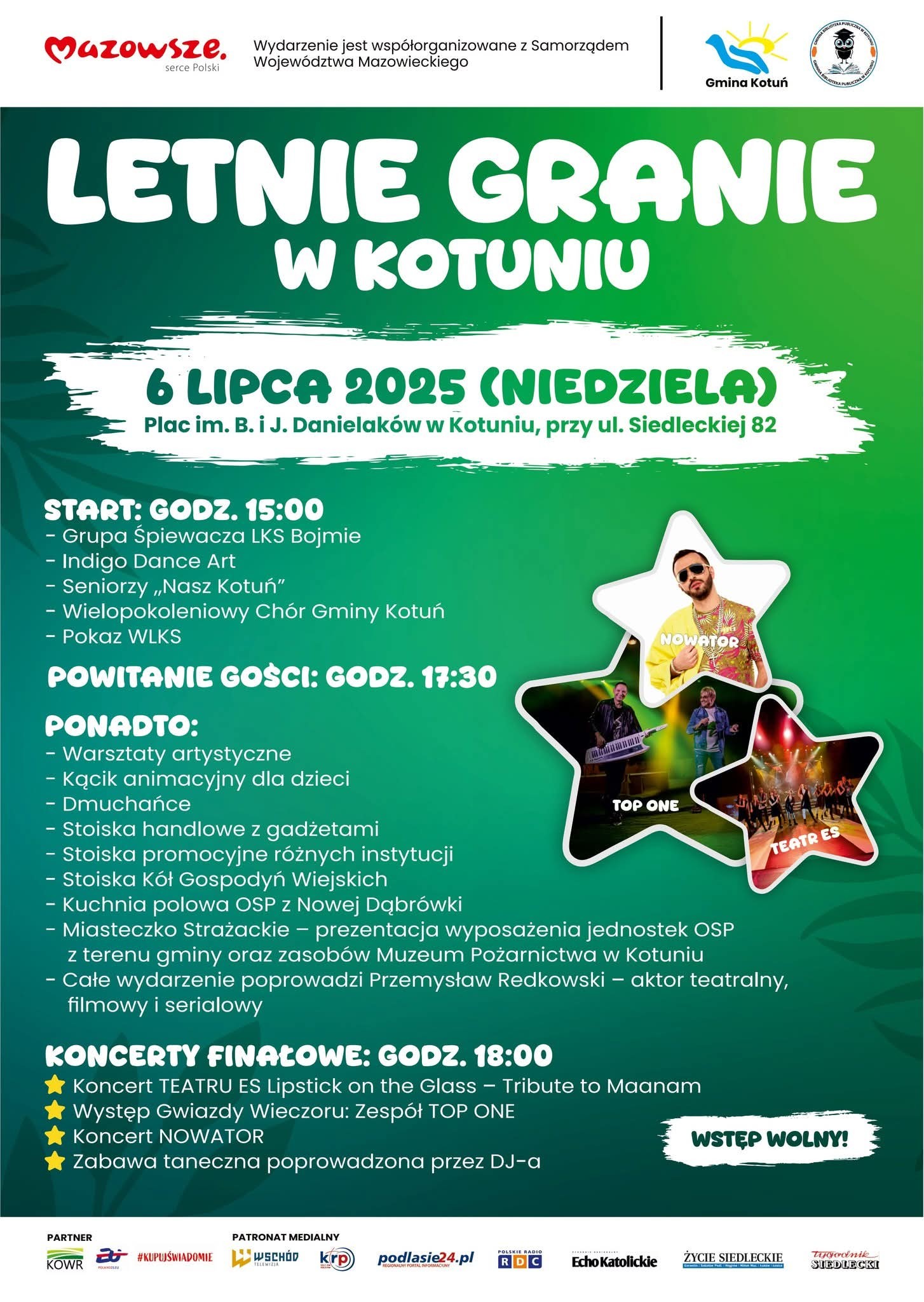 Występy miejscowych zespołów i gwiazd, warsztaty artystyczne, stoiska Kół Gospodyń Wiejskich, Miasteczko Strażackie i dyskoteka pod chmurką. To tylko niektóre punkty Letniego Grania w Kotuniu. Festyn odbędzie się w niedzielę 6 lipca. Na Placu Danielaków będzie można zobaczyć to, co Gmina Kotuń ma najlepszego.