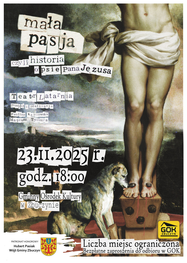 Na scenie Gminnego Ośrodka Kultury w Zbuczynie będzie można zobaczyć głośny spektakl "Mała Pasja, czyli historia o psie Pana Jezusa" w wykonaniu Teatru Latarnia. cena GOK zamieni się w scenę teatralną już w najbliższą niedzielę, 23 listopada.