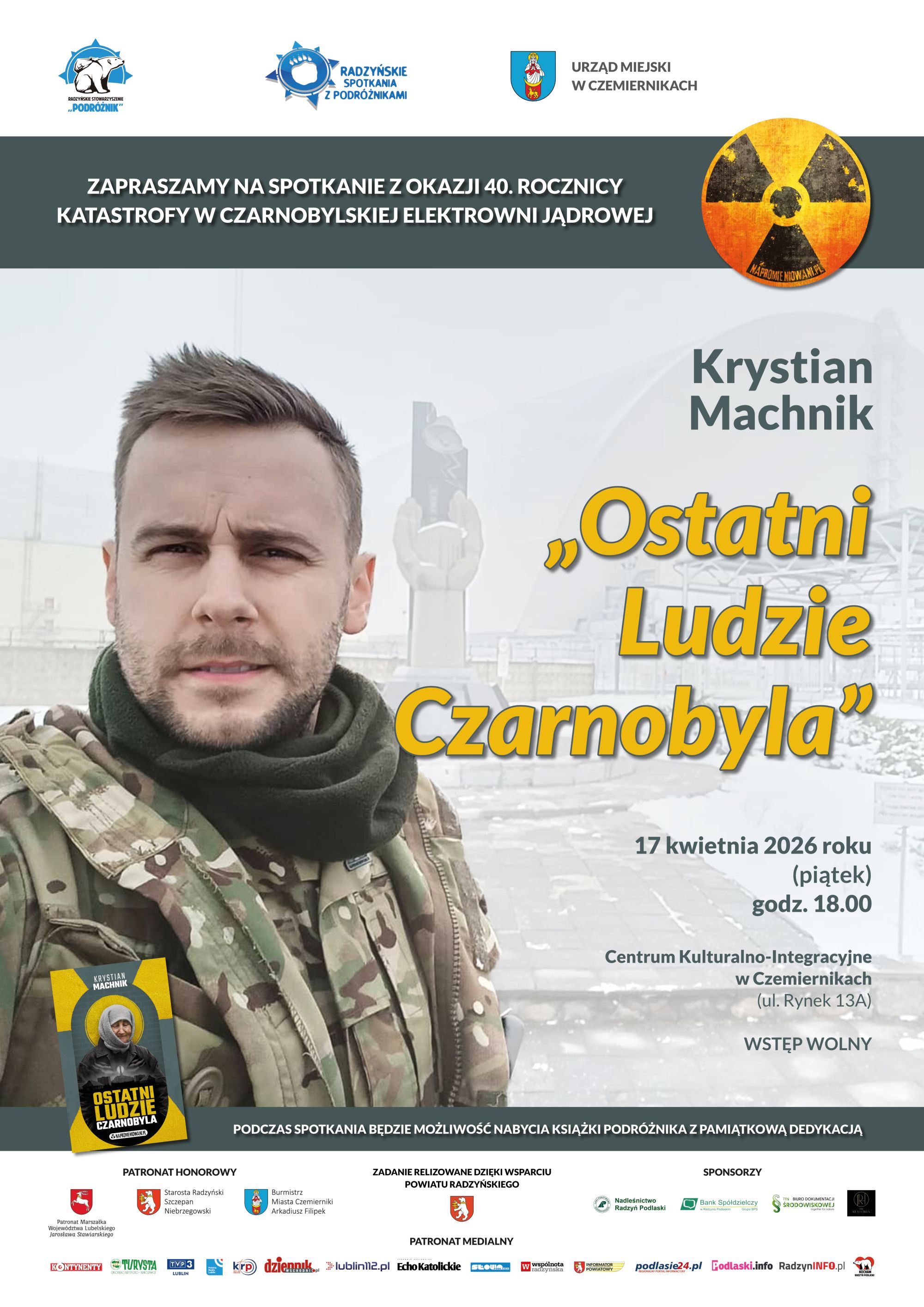 Wydarzenie zaplanowano na 17 kwietnia o godz. 18:00 w Centrum Kulturalno-Integracyjnym w Czemiernikach (ul. Rynek 13a). Spotkanie odbędzie się w ramach 59. odsłony „Radzyńskich Spotkań z Podróżnikami”, organizowanych przez Radzyńskie Stowarzyszenie „Podróżnik”. Wstęp jest bezpłatny.Gościem wieczoru będzie Krystian Machnik – podróżnik, reportażysta i autor książki „Ostatni Ludzie Czarnobyla”. Opowiada ona o losach tzw. samosiołów, czyli mieszkańców, którzy po przymusowych wysiedleniach wrócili do swoich domów w zamkniętej strefie wokół elektrowni. Choć po katastrofie wróciło tam około 1600 osób, dziś żyje już tylko garstka – ostatni świadkowie tamtych wydarzeń.