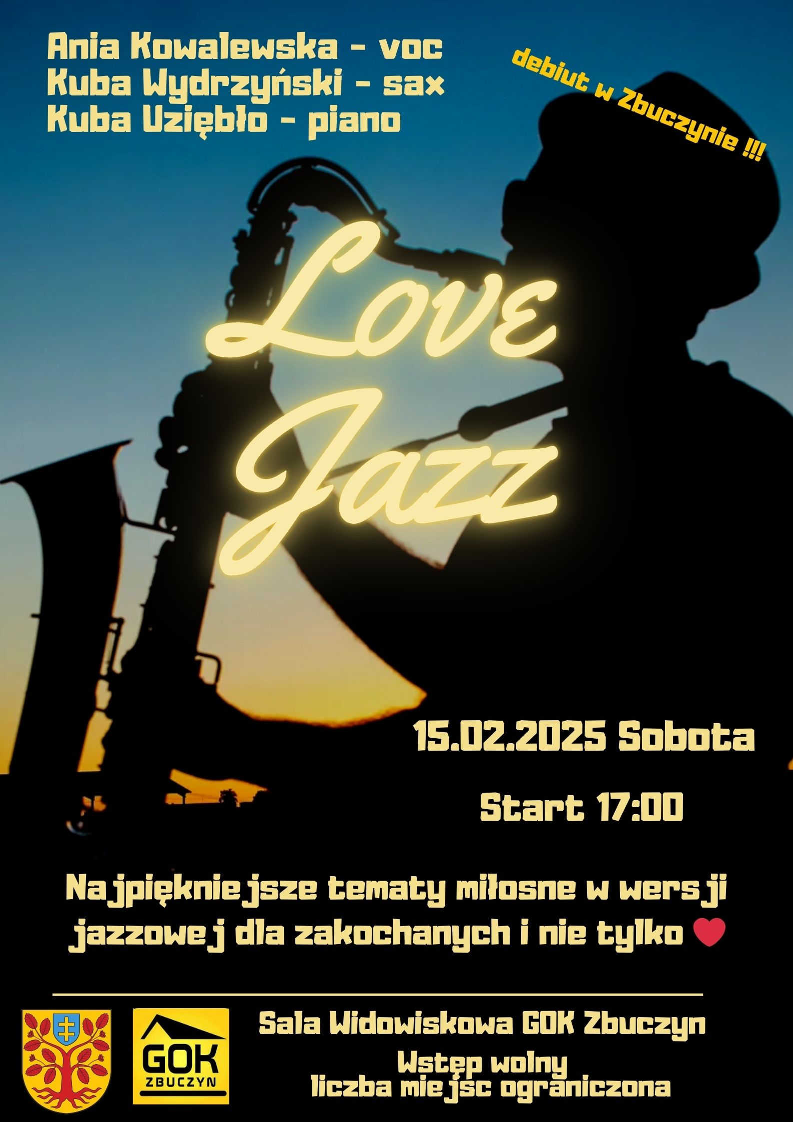 Największe przeboje muzyki rozrywkowej oraz standardy jazzowe nawiązujące do miłości wypełnią repertuar sobotniego koncertu „Love jazz” w Gminnym Ośrodku Kultury w Zbuczynie. Z okazji święta zakochanych, w sali widowiskowej ośrodka, polskie i anglojęzyczne szlagiery zaprezentuje trio młodych artystów związanych z Uniwersytetem Muzycznym Fryderyka Chopina w Warszawie.