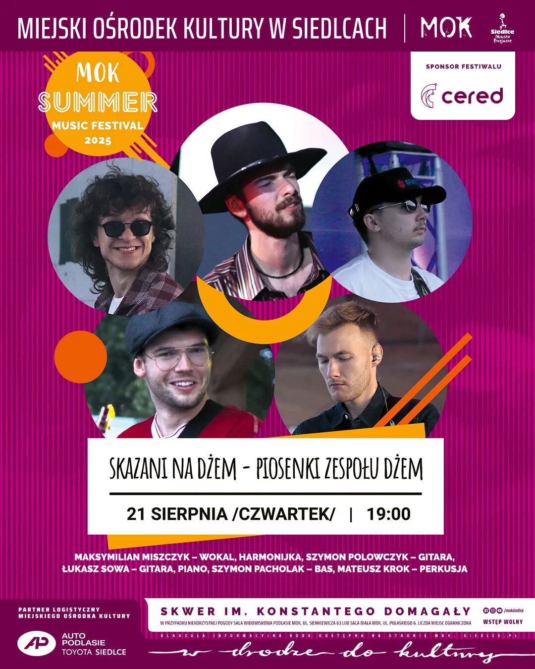 21 sierpnia o godz. 19:00 przy Skwerze im. Konstantego Domagały w Siedlcach odbędzie się koncert z cyklu MOK Summer Music Festival. Przed publicznością wystąpi zespół Skazani na Dżem.