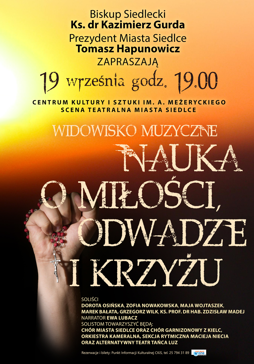 Na Scenie Teatralnej Miasta Siedlce już 19 września o godz. 19:00 odbędzie się widowisko muzyczne „Nauka o miłości, odwadze i Krzyżu”. Przedstawienie przypomina strajk uczniów Zespołu Szkół Rolniczych w Miętnem z 1984 roku, którzy protestowali w obronie krzyży w szkole. Słowo, muzyka i taniec przybliżą emocje tamtych dni.