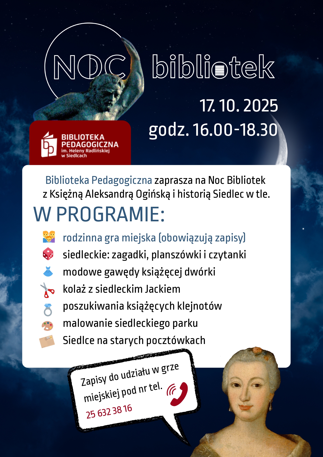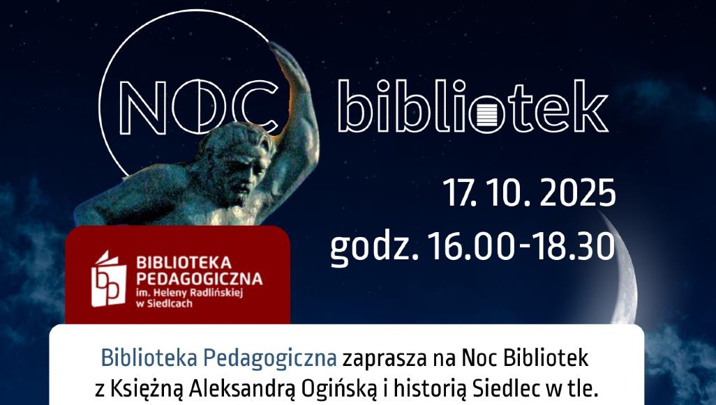 „Noc Bibliotek z Księżną Aleksandrą Ogińską i historią Siedlec w tle” – pod takim hasłem Biblioteka Pedagogiczna w Siedlcach przystąpi do tegorocznej, 11. edycji Nocy Bibliotek. Między godziną 16.00 a 18.30 instytucja udostępni swoją przestrzeń dla osób zainteresowanych udziałem w zaplanowanych aktywnościach.Wśród zaplanowanych aktywności znajdują się m.in.: