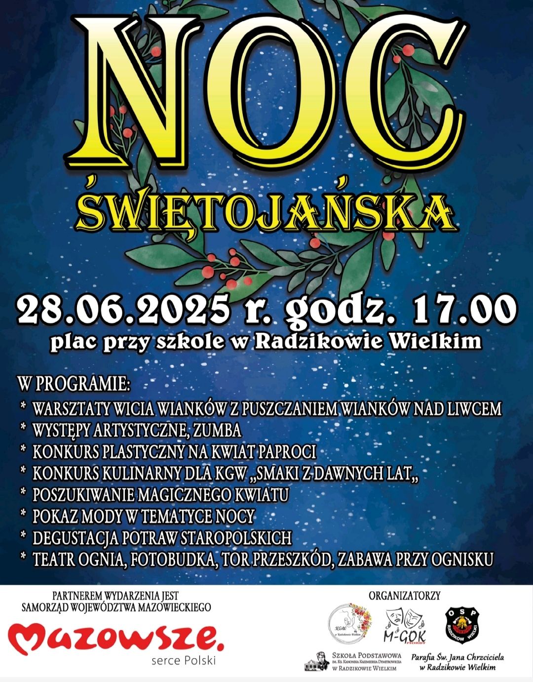 Koło Gospodyń Wiejskich w Radzikowie Wielkim we współpracy z partnerami zaprasza na wyjątkowe wydarzenie o charakterze międzypokoleniowym – obchody Nocy Świętojańskiej, które odbędą się 28 czerwca.