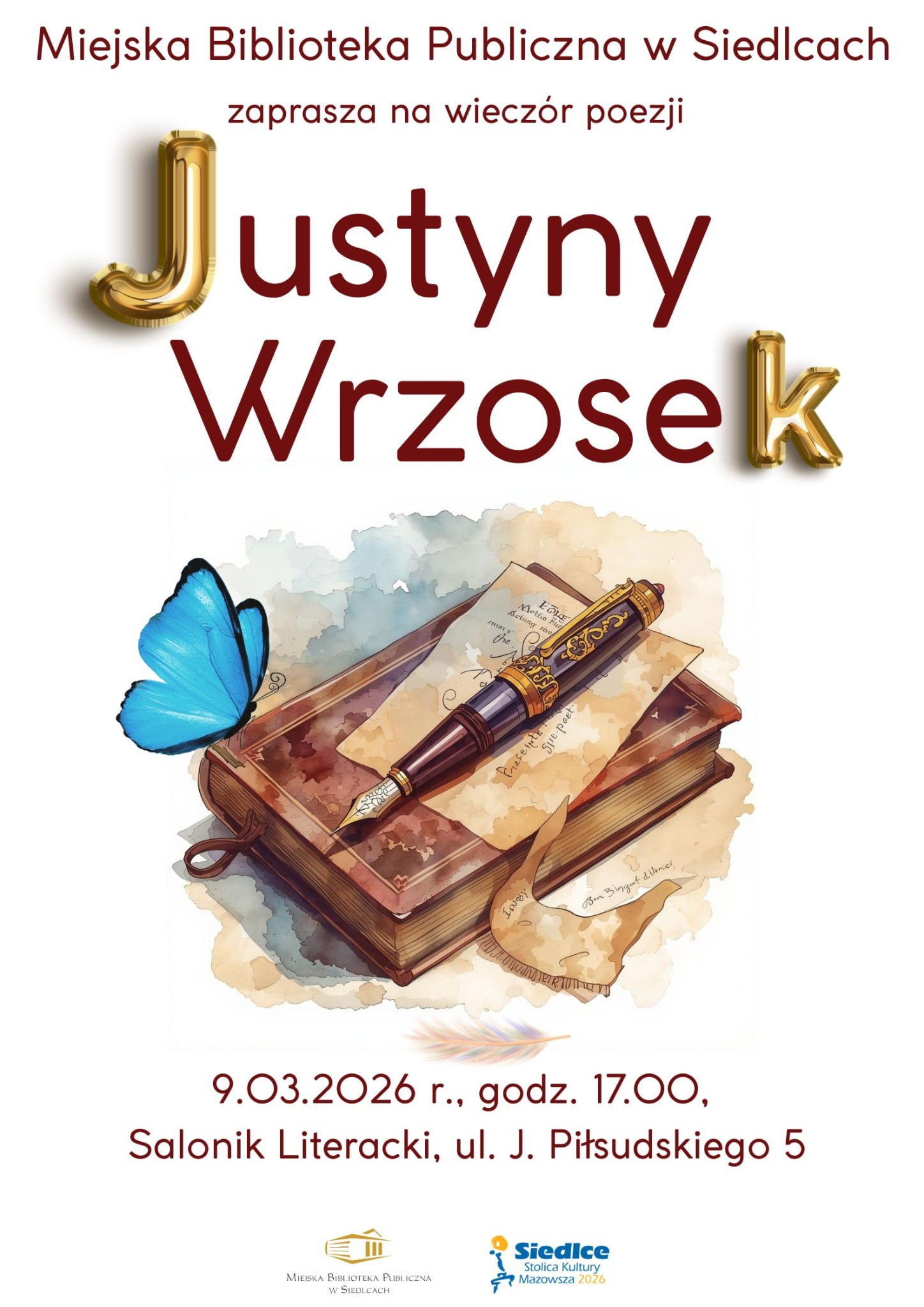 Justyna Wrzosek urodziła się w Białymstoku. Ukończyła teologię oraz filologię polską na Uniwersytecie Kardynała Stefana Wyszyńskiego w Warszawie. Poezję tworzy od 1996 roku i jest autorką 16 tomików wierszy, wśród których znajdują się m.in. „Kropla ciszy”, „W 90 lat dookoła siedleckiej ziemi”, „Wał-rudzki pierwiosnek” oraz „Blask serca”.Poetka należy do Siedleckiej Grupy Literackiej „Witraż”, działającej przy Miejskim Ośrodku Kultury w Siedlcach. Spotkanie będzie okazją do wysłuchania autorskiej interpretacji wierszy oraz rozmowy o twórczości.