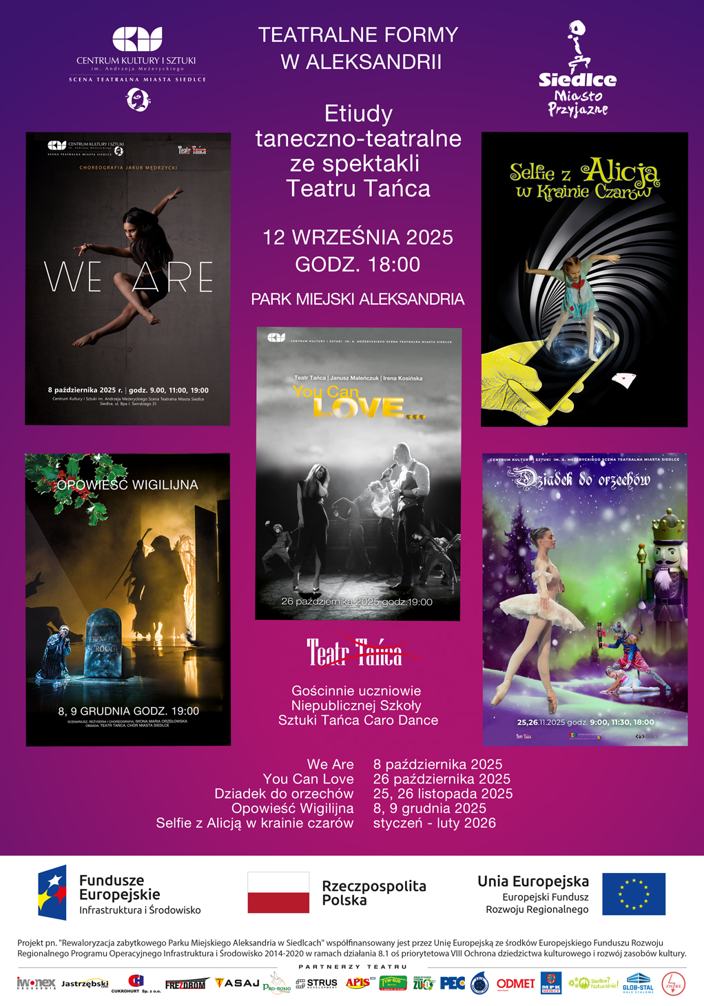 Teatralno-taneczne etiudy w plenerze, zapowiadające nowe premiery Sceny Teatralnej Miasta Siedlce, zostaną zaprezentowane szerokiej publiczności w czwartek, 12 września o godzinie 18:00 w Parku Miejskim Aleksandria. Pokaz przygotowali Tancerze Teatru Tańca.
