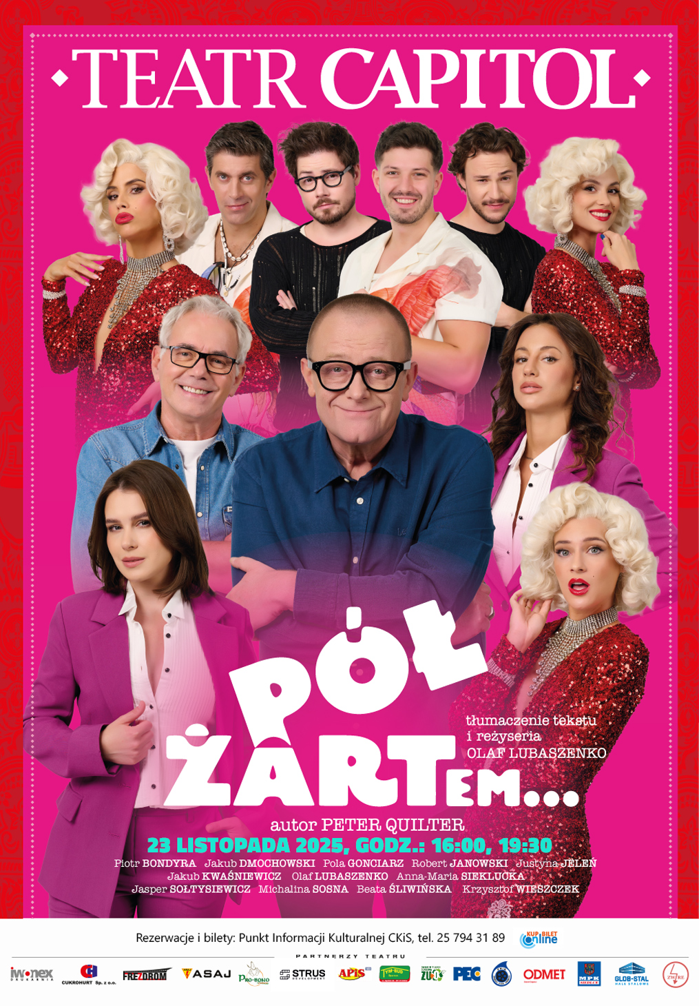 Spektakl „Pół żartem…” w wykonaniu Teatru Capitol z Warszawy będzie można zobaczyć na Scenie Teatralnej Miasta Siedlce już 23 listopada. Sztuka autorstwa Petera Quiltera zostanie zaprezentowana o godzinie 16:00 i 19:30. W rolach głównych wystąpią: Olaf Lubaszenko, Piotr Bondyra, Anna Maria Sieklucka, Jasper Sołtysiewicz oraz Beata Śliwińska. Przedstawienie znalazło się w programie XIII Ogólnopolskiego Festiwalu Teatrów „Sztuka plus Komercja”.
