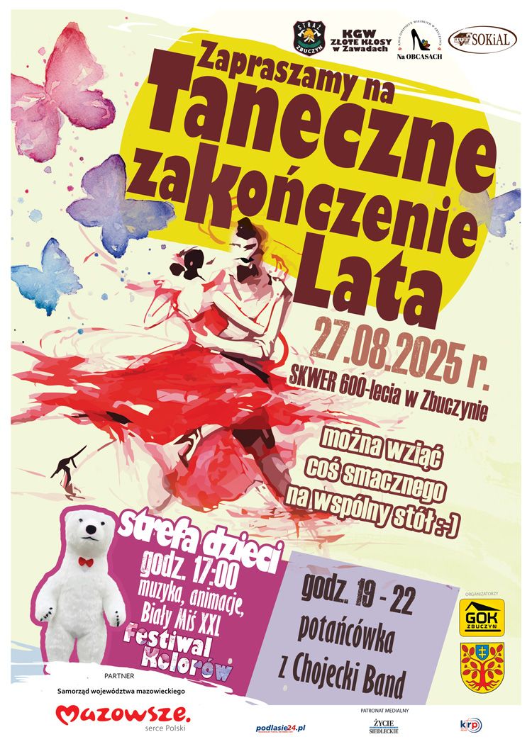 Na uczestników czekać będzie muzyka na żywo oraz największe wakacyjne przeboje, które porwą do tańca każdego – niezależnie od wieku! Nie zabraknie także niepowtarzalnej atmosfery letniego wieczoru. Będzie to doskonała okazja, by spotkać się ze znajomymi i pożegnać wakacje w rytmach dobrej zabawy!- Od 17:00 do 19:00 zaplanowaliśmy różne atrakcje dla najmłodszych. Czas dzieciom umili gigantyczny uroczy towarzysz imprezy - Biały Miś XXL, muzyka oraz animacje. O 19:00 zapraszamy na potańcówkę. Zabierzcie dobry humor, wygodne buty i zatańczcie z nami pod gwiazdami, to będzie wyjątkowy taneczny wieczór– podkreśliła Iwona Zdziechowska, dyrektor Gminnego Ośrodka Kultury w Zbuczynie.