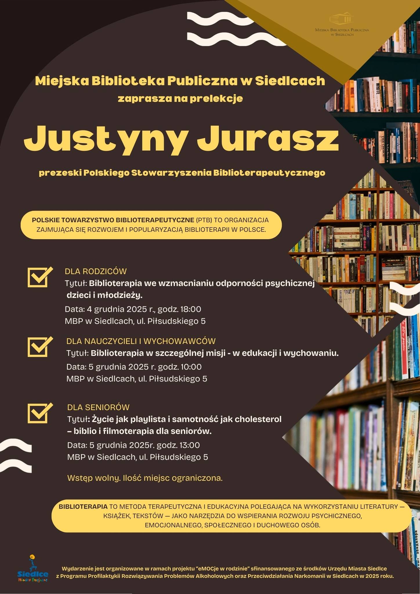 Justyna Jurasz – prezes Polskiego Stowarzyszenia Biblioterapeutycznego poprowadzi w pierwszych dniach grudnia spotkania poświęcone biblioterapii w Miejskiej Bibliotece Publicznej w Siedlcach. Zaplanowano trzy różne tematy skierowane do odmiennych grup odbiorców, jednak wszystkie łączy idea wykorzystania literatury jako narzędzia wspierającego rozwój emocjonalny, społeczny i psychiczny.