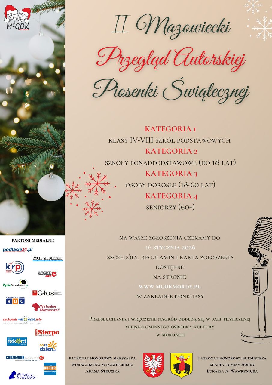 Miejsko-Gminny Ośrodek Kultury w Mordach czeka na zgłoszenia od osób, które chcą wziąć udział w II Mazowieckim Przeglądzie Autorskiej Piosenki Świątecznej. Termin zgłoszeń upływa 16 stycznia. Wydarzeniu patronują Katolickie Radio Podlasie oraz portal podlasie24.
