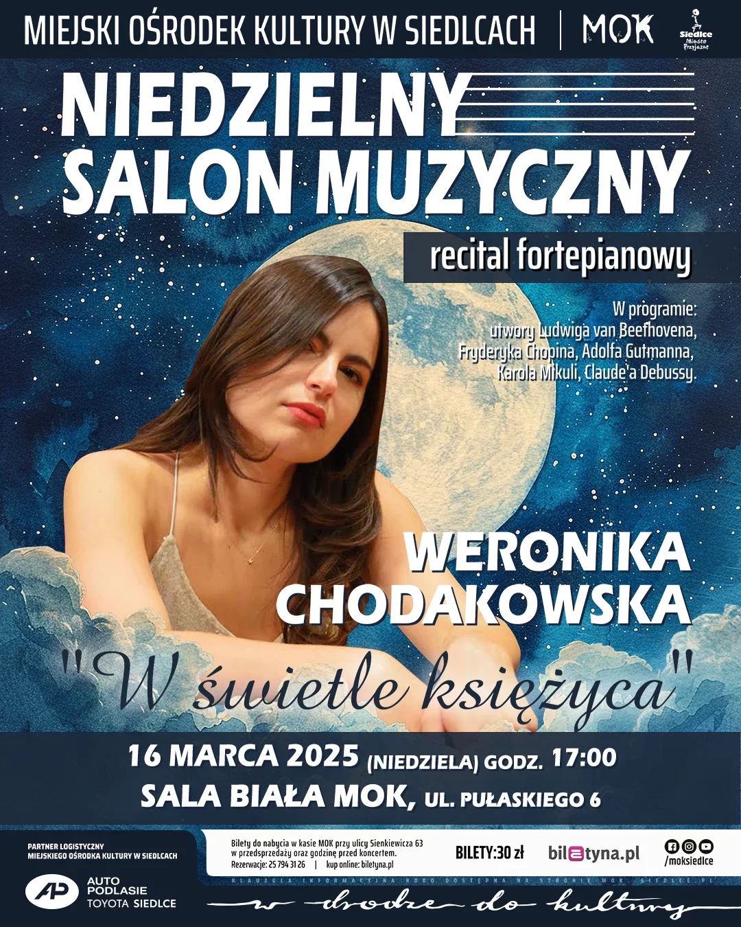 Pianistka Weronika Chodakowska zaprasza na niepowtarzalny wieczór z muzyką fortepianową na żywo. Podczas koncertu publiczność wysłucha najpiękniejszych kompozycji zainspirowanych magią nocy. W programie koncertu nie zabraknie takich arcydzieł jak „Sonata Księżycowa” Ludwiga van Beethovena, „Nokturn cis-moll” Fryderyka Chopina czy „Clair de lune” Claude’a Debussy’ego. Ponadto artystka zaprezentuje słuchaczom mniej znane dzieła takich twórców jak Adolf Gutmann czy Karol Mikuli, którego premierowe nagrania utworów Weronika Chodakowska wydała na swoim debiutanckim albumie „From Lviv to Paris”.Każdy utwór zostanie wzbogacony o unikalne, zmieniające się kolory świateł, które w połączeniu z prezentacją najpiękniejszych obrazów stworzą wyjątkową atmosferę. Kojące dźwięki fortepianu i wieczorny nastrój sprawią, że słuchacze zapomną o codzienności, a relaksujący dobór repertuaru pozwoli uczestnikom tego muzycznego spotkania wyciszyć się w otoczeniu cudownej muzyki inspirowanej księżycową aurą.