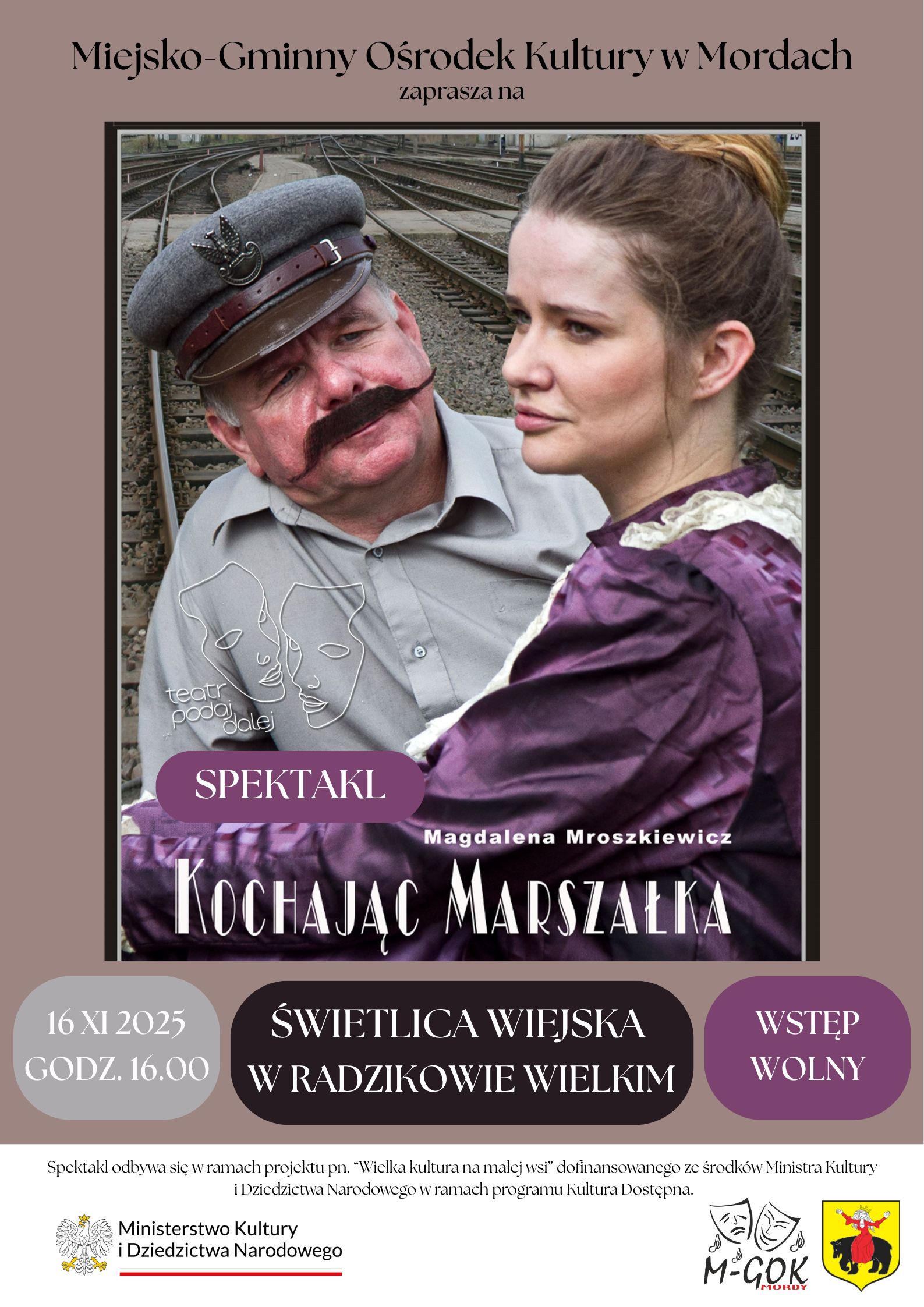 Miejsko-Gminny Ośrodek Kultury w Mordach zaprasza na wyjątkowy spektakl pt. „Kochając Marszałka” w wykonaniu Teatru Podaj Dalej. Przedstawienie odbędzie się w niedzielę, 16 listopada o godz. 16.00 w Świetlicy Wiejskiej w Radzikowie Wielkim.