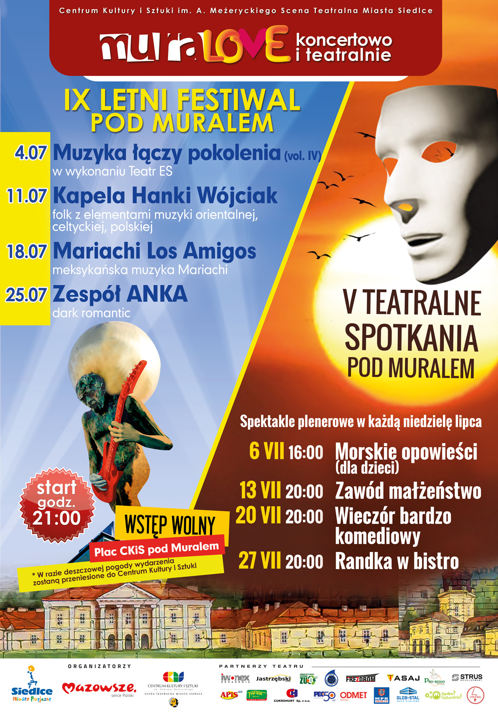 Centrum Kultury i Sztuki w Siedlcach zaprasza na IX edycję Letniego Festiwalu pod Muralem oraz V Teatralne Spotkania pod Muralem. W ramach Festiwalu odbędą się cztery wyjątkowe koncerty, które będą miały miejsce w każdy piątek lipca o godz. 21:00. Wystąpią: Teatr ES z koncertem „Muzyka łączy pokolenia" vol. IV, Kapela Hanki Wójciak, Mariachi Los Amigos i Zespół ANKA. W każdą niedzielę lipca scena pod muralem stanie się przestrzenią teatralną za sprawą V Teatralnych Spotkań pod Muralem, w repertuarze których zobaczymy przedstawienie dla dzieci pt. "Morskie opowieści" oraz spektakle dla dorosłych: "Zawód małżeństwo", "Wieczór bardzo komediowy" i "Randka w bistro". Szczegóły poniżej.
