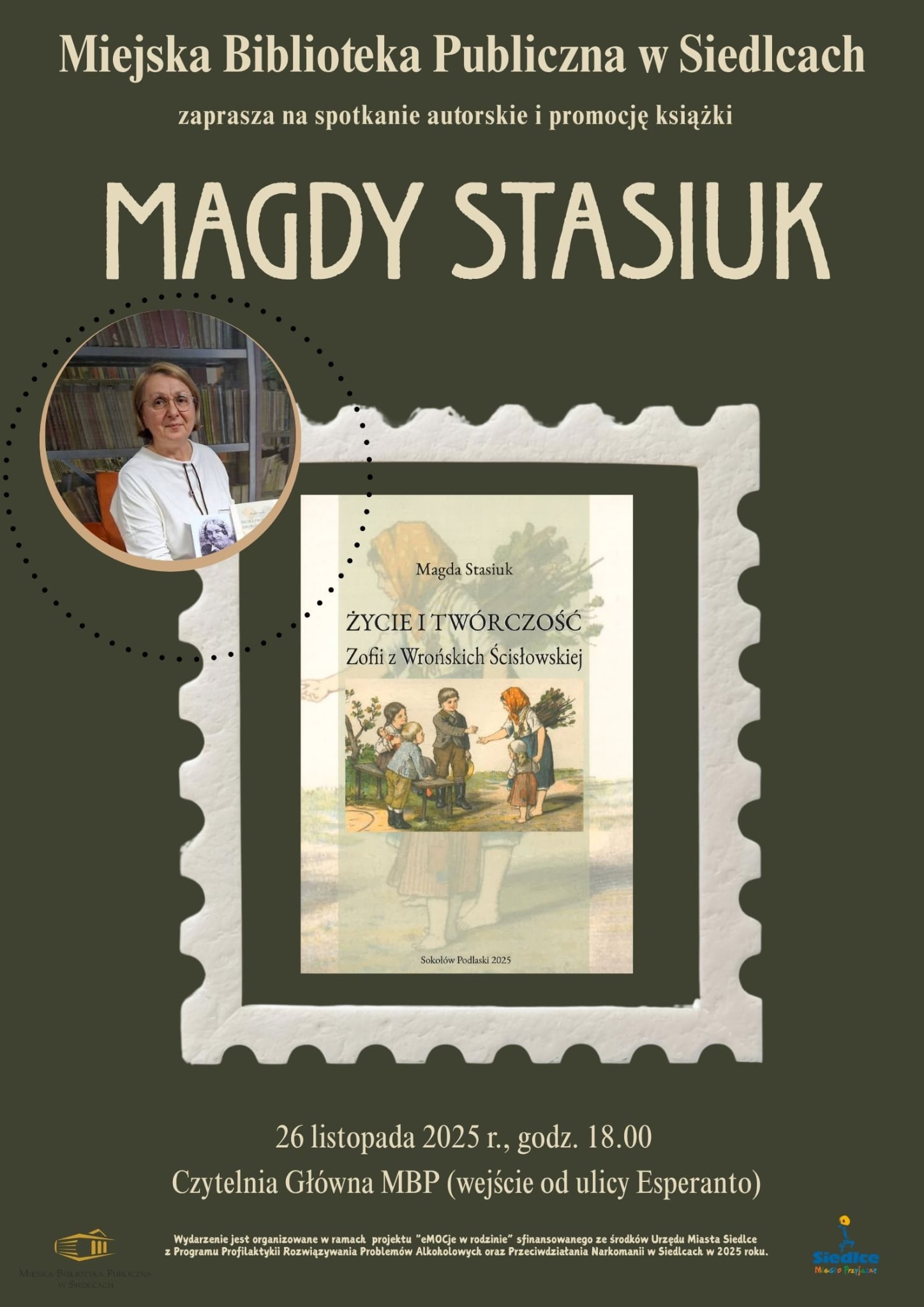 Miejska Biblioteka Publiczna w Siedlcach zaprasza na wyjątkowe spotkanie autorskie z Magdą Stasiuk, połączone z promocją jej najnowszej książki pt. „Życie i twórczość Zofii z Wrońskich Ścisłowskiej”.
