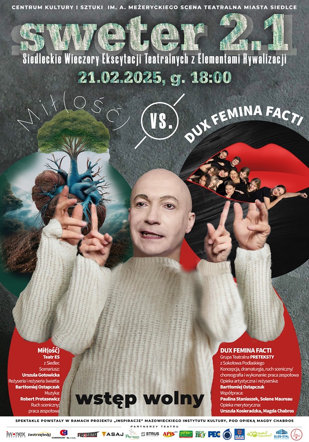 Na Scenie Teatralnej Miasta Siedlce odbędą się Siedleckie Wieczory Ekscytacji Teatralnej z Elementami Rywalizacji SWETER 2.1, podczas których będzie można zobaczyć dwa spektakle: DUX FEMINA FACTI Grupy Teatralnej PRETEKSTY z Sokołowa Podlaskiego oraz przedstawienie "Mił(ość)" Teatru ES.