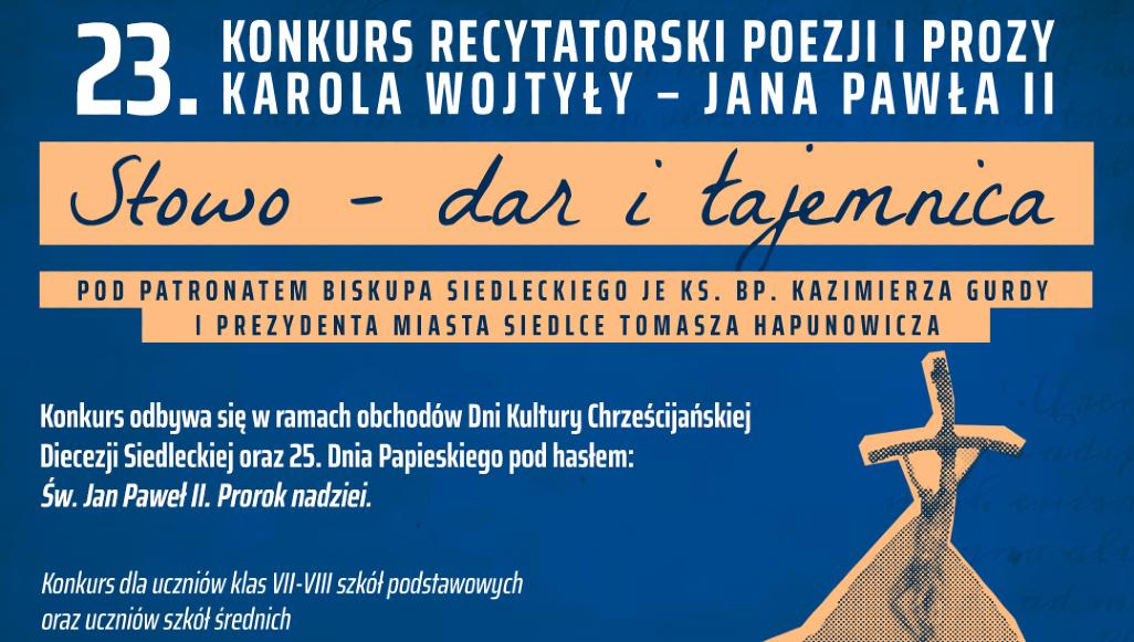 Miejski Ośrodek Kultury w Siedlcach zaprasza uczniów klas VII–VIII szkół podstawowych oraz uczniów szkół średnich do udziału w XXIII Konkursie Recytatorskim Poezji i Prozy Karola Wojtyły – Jana Pawła II pod hasłem „Słowo – dar i tajemnica”. Konkurs odbywa się w ramach Dni Kultury Chrześcijańskiej Diecezji Siedleckiej oraz 25. Dnia Papieskiego, który w tym roku przebiega pod hasłem „Św. Jan Paweł II. Prorok nadziei”.