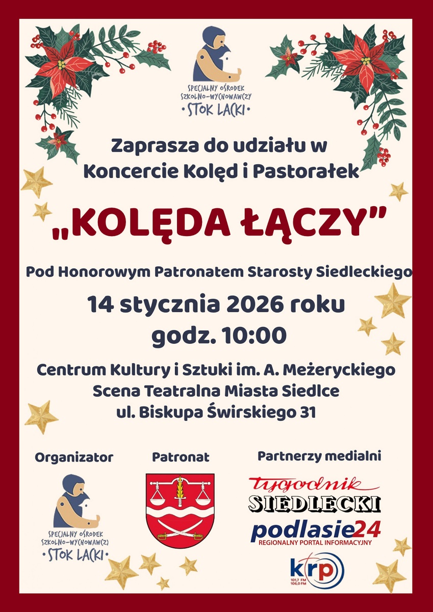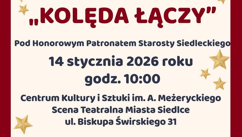 Koncert „Kolęda łączy” to wydarzenie, które na stałe wpisało się w tradycję Siedlec i co roku gromadzi liczne grono uczestników oraz gości. W tegorocznej edycji na Scenie Teatralnej Miasta Siedlce będzie można obejrzeć występy dzieci i młodzieży z różnych placówek edukacyjnych: przedszkoli, szkół podstawowych i ponadpodstawowych, ośrodków szkolno-wychowawczych oraz warsztatów terapii zajęciowej z Siedlec i regionu. Młodzi wykonawcy zaprezentują swoje talenty wokalne i taneczne, wykonując we własnych aranżacjach tradycyjne kolędy oraz pastorałki.Celem koncertu jest przede wszystkim integracja dzieci i młodzieży z różnych środowisk i placówek, promowanie otwartości, wrażliwości oraz wzajemnego szacunku wobec drugiego człowieka, a także rozwijanie pasji artystycznych i budowanie wspólnoty poprzez muzykę, która łączy ludzi bez względu na różnice.