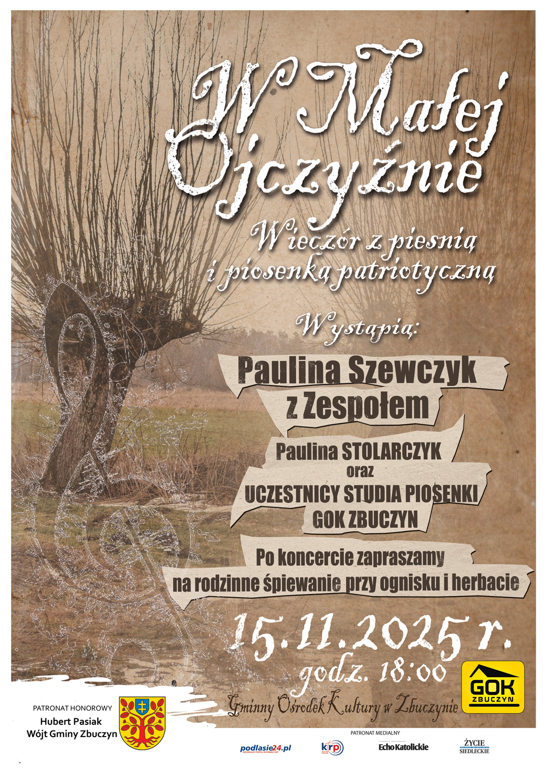 Pieśni i piosenki patriotyczne zabrzmią w najbliższą sobotę w rozmaitych odsłonach w Gminnym Ośrodku Kultury w Zbuczynie. Koncert „W Małej Ojczyźnie" połączony będzie ze wspólnym śpiewaniem przy ognisku i jesiennej herbacie.