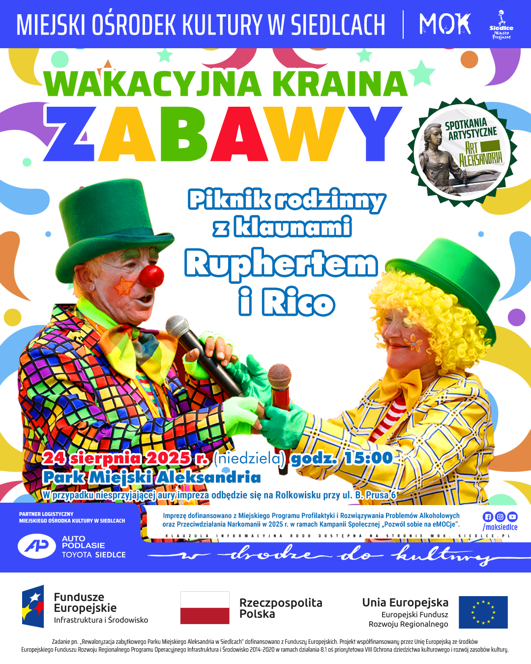 24 sierpnia godz. 15:00 w Parku Miejskim Aleksandria w Siedlcach odbędzie się Wakacyjna Kraina Zabawy - Piknik rodzinny z klaunami Ruphertem i Rico.