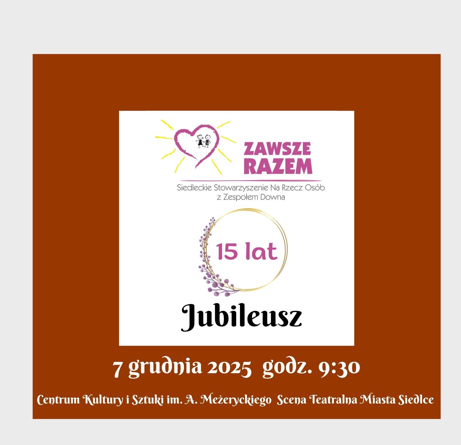 Siedleckie Stowarzyszenie na rzecz Osób z Zespołem Downa „Zawsze Razem” obchodzi w tym roku jubileusz 15-lecia działalności. Jubileuszowa gala odbędzie w niedzielę, 7 grudnia w Centrum Kultury i Sztuki w Siedlcach. Patronuje jej Katolickie Radio Podlasie oraz portal Podlasie24.