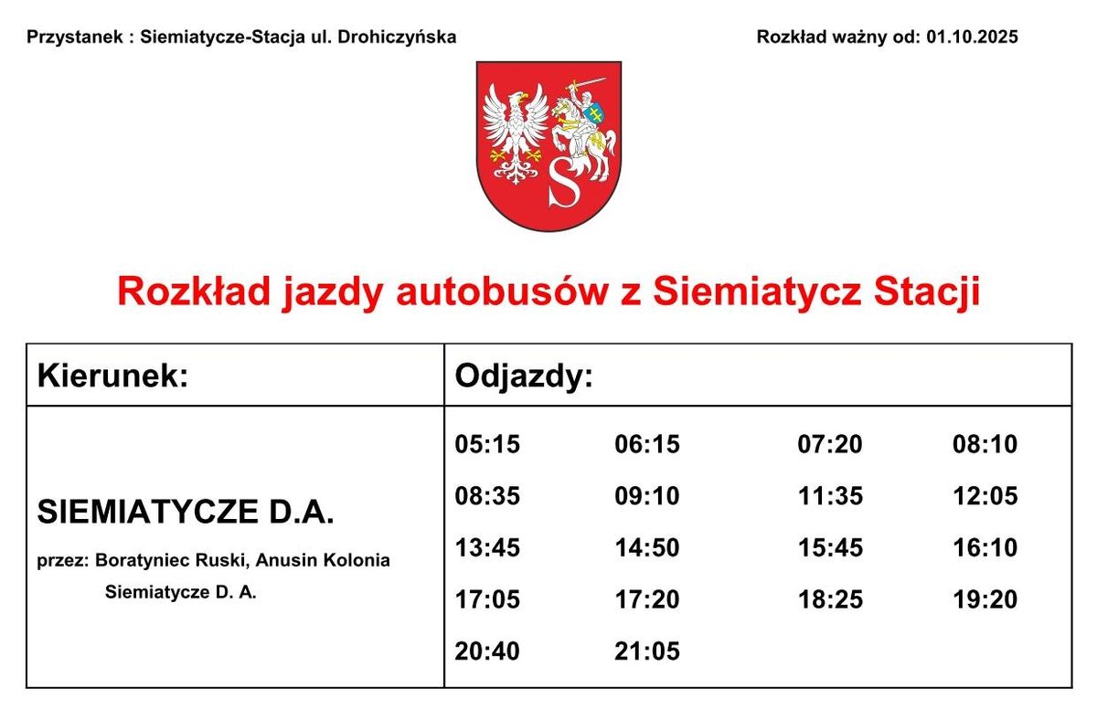 Pociągiem można wyruszyć z pięknego, wyremontowanego dworca PKP Siemiatycze i pojechać do Siedlec, Czeremchy, Hajnówki, a nawet do Warszawy czy Gdyni. Jednak podróż często kończyła się na samym początku, bo z Siemiatycz od lat nie ma połączeń autobusowych na dworzec. 8 km dzielące Siemiatycze od Siemiatycz Stacji, dla wielu osób było do tej pory barierą nie do pokonania. O sprawie wiele już było powiedziane i napisane. Od gadania czas do działania. Nareszcie!Od 1 październik powiat siemiatycki uruchamia pilotażową linię komunikacji autobusowej między Siemiatyczami a Siemiatyczami Stacją. Zaplanowano kilkanaście połączeń autobusowych na dobę. Pierwszy autobus wyjedzie z Siemiatycz o godz. 4.50, a ostatni o 20.40. Z dworca pierwszy autobus pojedzie w kierunku Siemiatycz o 5:15, ostatnie kurs ruszy o 21:05.