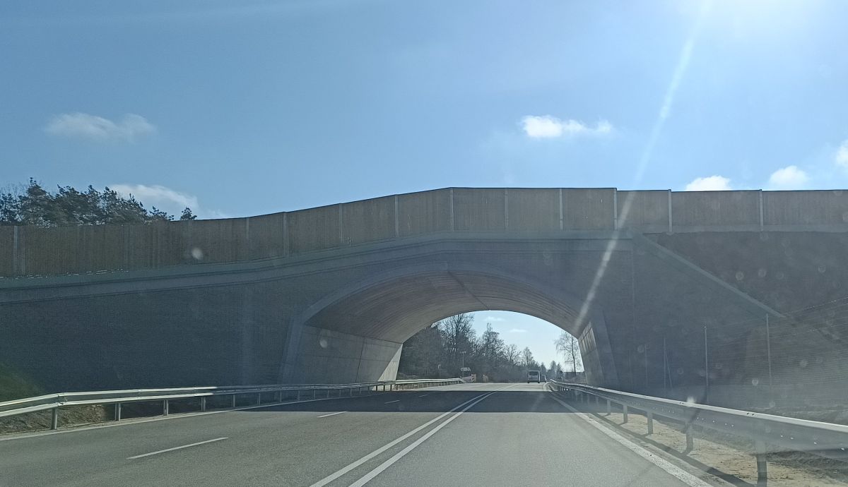 Zasadnicza konstrukcja powstała już dawno, ale roboty związane z jej wykończeniem ciągle blokowały przejazd. Trzeba było zwalniać i objeżdżać to miejsce prowizorycznie położonym w lesie, coraz bardziej popękanym i zapadającym się asfaltem. Teraz można już jechać prosto pod charakterystycznym łukiem. Jeszcze nie z pełną prędkością, uważając na ustawione na poboczu słupki, bo roboty jeszcze trwają. Likwidacja objazdu, formowanie prowadzącego na przejście nasypu i nasadzenia zajmą jeszcze kilka tygodni. Do tego czasu obowiązuje tam ograniczenie prędkości.