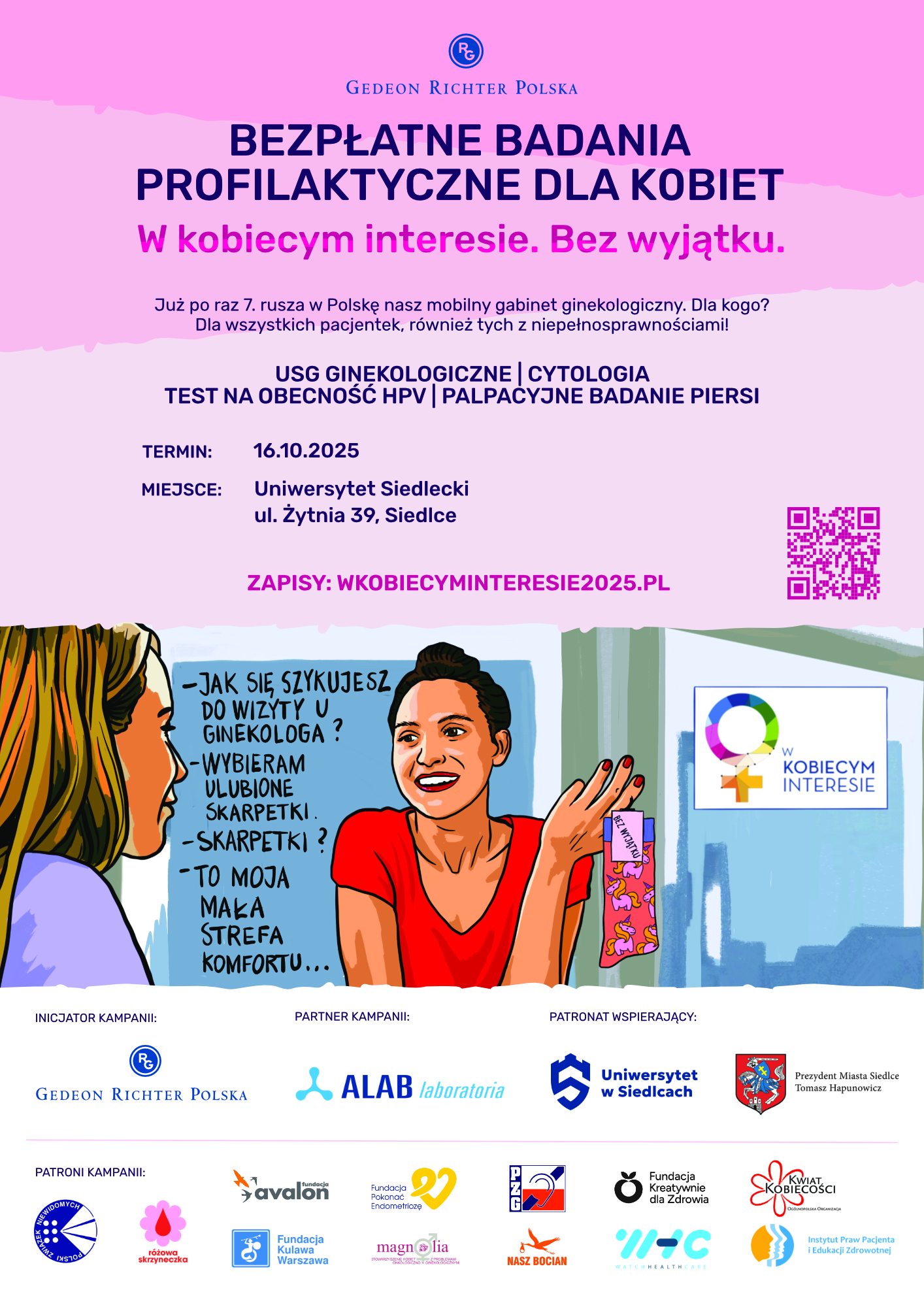 Już w połowie października mieszkanki Siedlec będą mogły skorzystać z bezpłatnych badań ginekologicznych w mobilnym gabinecie medycznym. Inicjatywa realizowana jest w ramach ogólnopolskiej kampanii „W Kobiecym Interesie”, która w tym roku przebiega pod hasłem „Bez wyjątku” – z naciskiem na dostępność profilaktyki dla każdej kobiety, niezależnie od wieku, kondycji zdrowotnej czy wrażliwości sensorycznej.