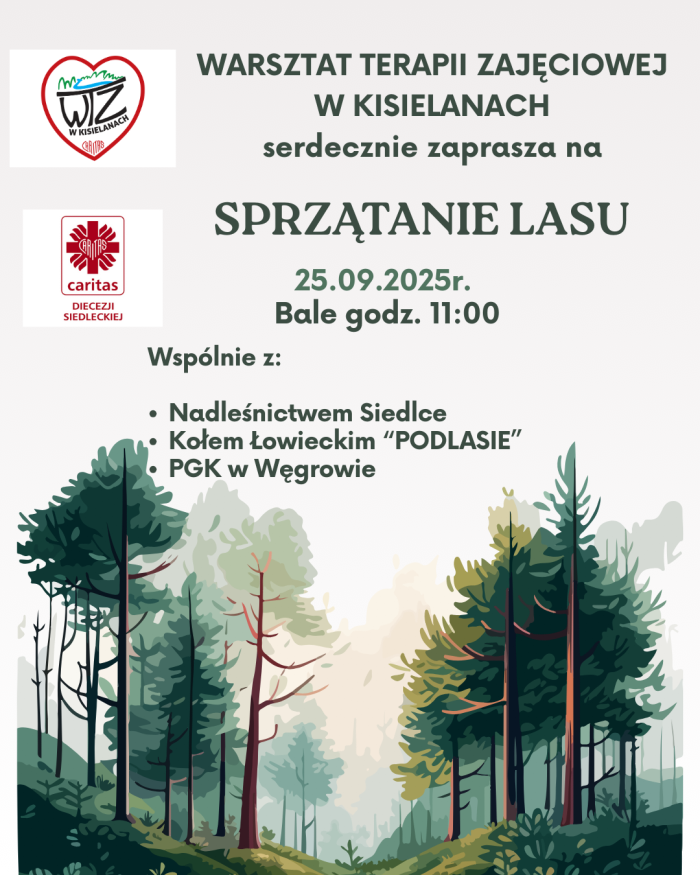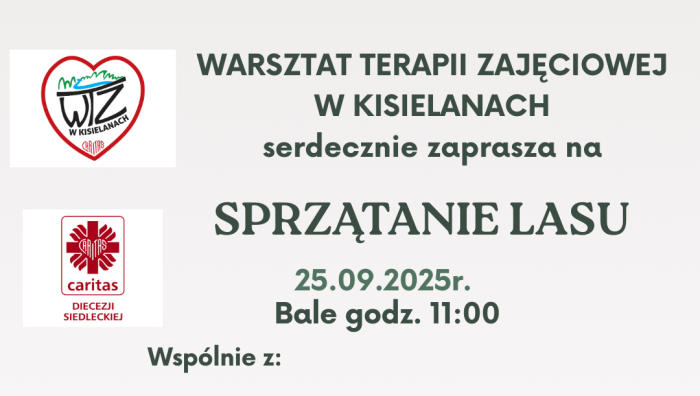 Osoby z niepełnosprawnościami z Warsztatów Terapii Zajęciowej Caritas Diecezji Siedleckiej w Kisielanach, Siedlcach i Skórcu wezmą udział w akcji ekologicznej polegającej na sprzątaniu lasu w Balach (gm. Mokobody). Inicjatywa odbędzie się 25 września 2025 r., a jej początek zaplanowano na godz. 11:00 przy domku myśliwskim Koła Łowieckiego „Podlasie”.