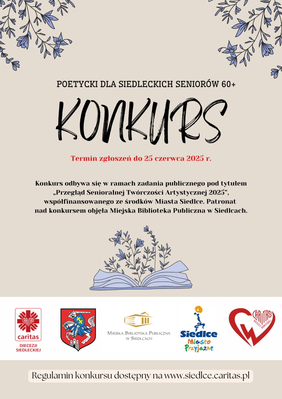 Caritas Diecezji Siedleckiej ogłasza Konkurs Poetycki dla seniorów 60+. Udział w nim mogą wziąć obecni i byli mieszkańcy Siedlec oraz okolic w wieku powyżej 60 lat.