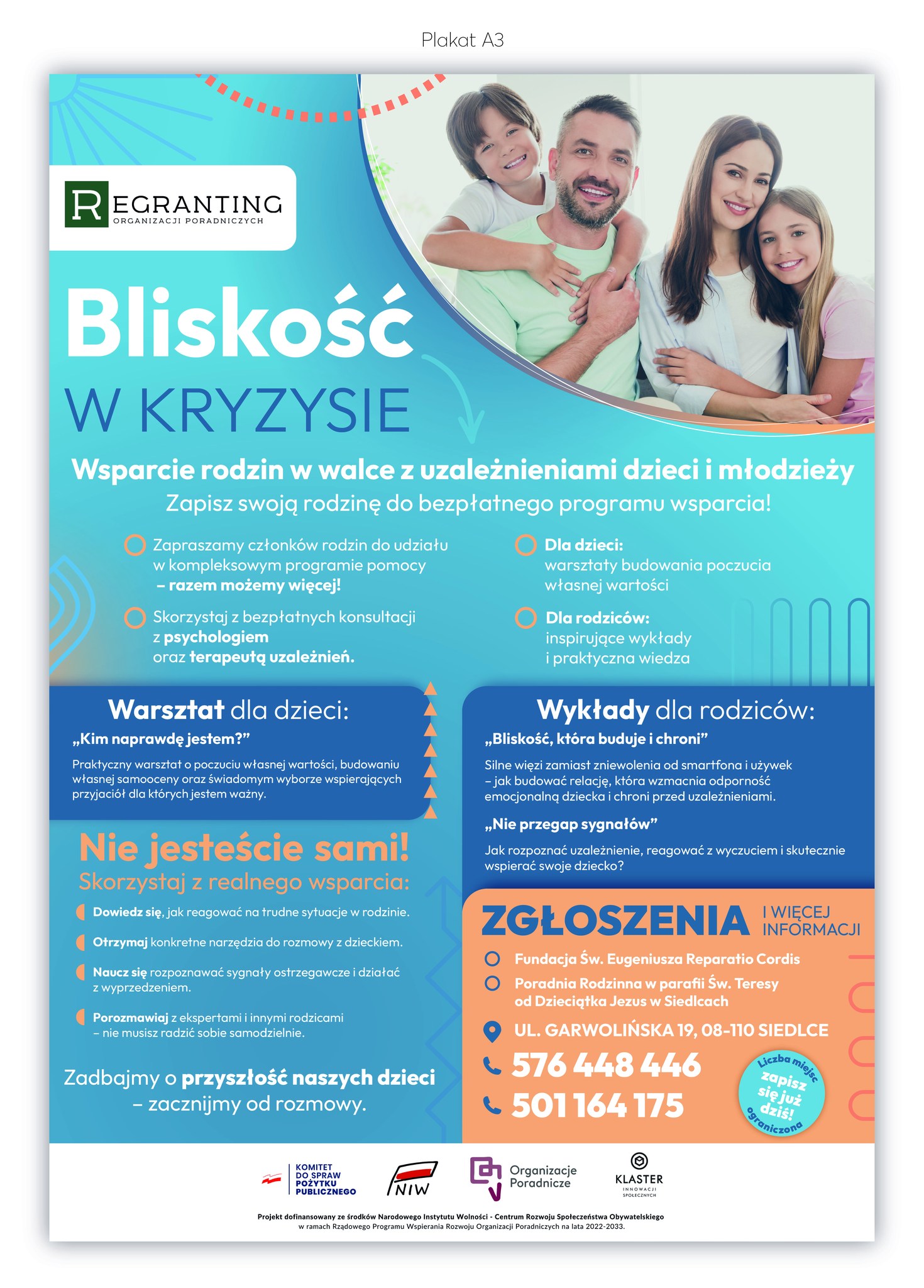 Fundacja św. Eugeniusza Reparatio Cordis, działająca przy parafii św. Teresy w Siedlcach, realizuje bezpłatny program dla dzieci i rodziców: „Bliskość w kryzysie – wsparcie rodzin w walce z uzależnieniami dzieci i młodzieży”.