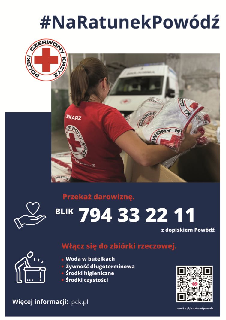 Polski Czerwony Krzyż działa w ścisłej współpracy z lokalnymi władzami, wspierając mieszkańców nie tylko na poziomie logistycznym, ale także psychologicznym. Organizowane schroniska, dostarczanie żywności i artykułów pierwszej potrzeby, a także działania ratownicze są kluczowe dla opanowania tej kryzysowej sytuacji. Od niedzieli Polski Czerwony Krzyż prowadzi zbiórkę finansową na rzecz poszkodowanych w powodzi. Wsparcie finansowe jest najefektywniejszą formą wsparcia pozwalająca na bieżący zakup najbardziej potrzebnych sprzętów i materiałów najbliżej miejsca kryzysu ograniczając koszty logistyki, transportu i magazynowania. Istnieje kilka sposobów na wsparcie poszkodowanych za pośrednictwem PCK:numer konta: 16 1160 2202 0000 0002 7718 3060